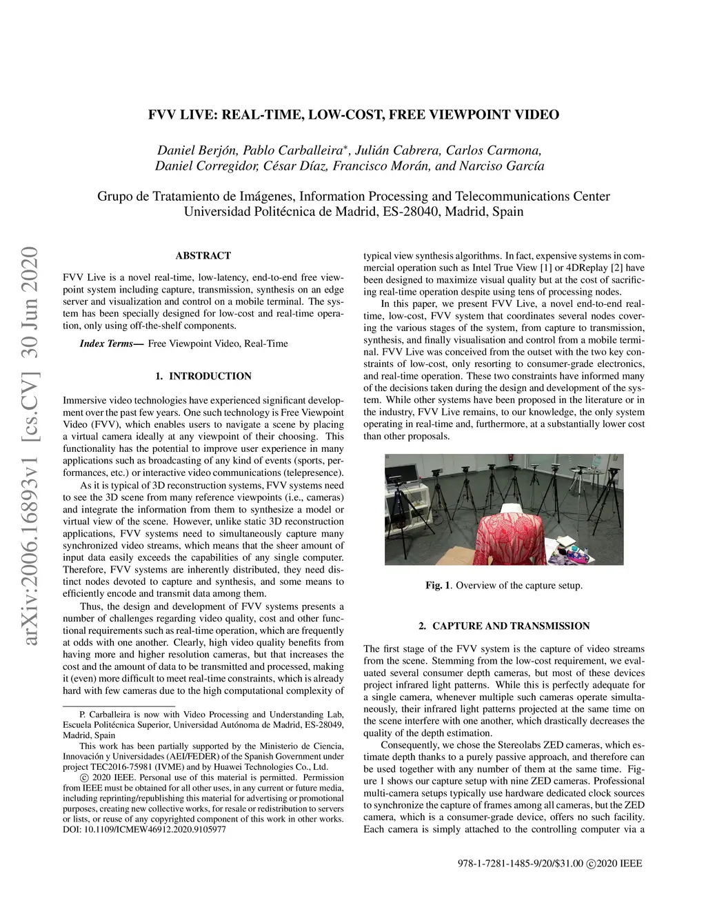 FVV Live is a novel real-time, low-latency, end-to-end free viewpoint system including capture, transmission, synthesis on an edge server and visualization and control on a mobile terminal. The system has been specially designed for low-cost and real-time operation, only using off-the-shelf components.