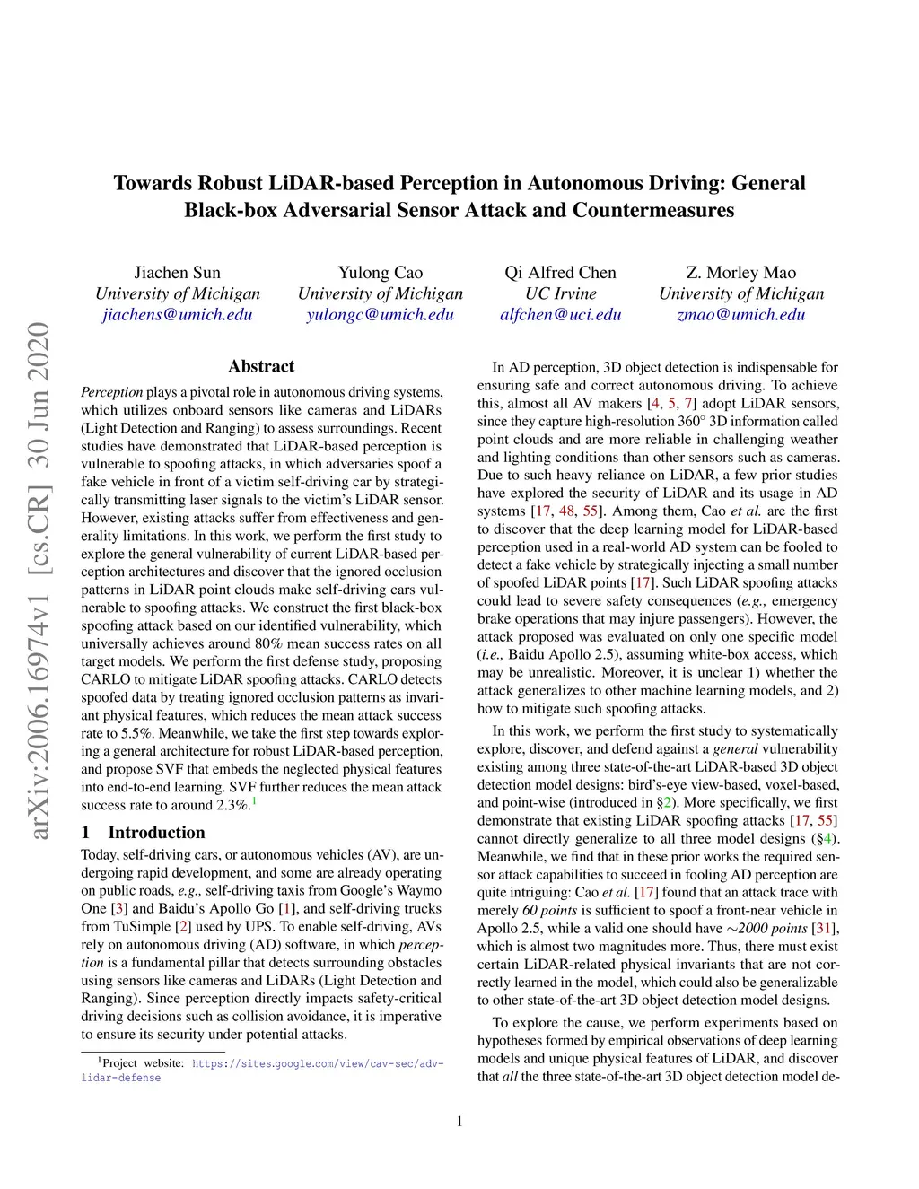 Perception plays a pivotal role in autonomous driving systems, which utilizes onboard sensors like cameras and LiDARs (Light Detection and Ranging) to assess surroundings. Recent studies have demonstrated that LiDAR-based perception is vulnerable to spoofing attacks, in which adversaries spoof a fake vehicle in front of a victim self-driving car by strategically transmitting laser signals to the victim's LiDAR sensor. However, existing attacks suffer from effectiveness and generality limitations. In this work, we perform the first study to explore the general vulnerability of current LiDAR-based perception architectures and discover that the ignored occlusion patterns in LiDAR point clouds make self-driving cars vulnerable to spoofing attacks. We construct the first black-box spoofing attack based on our identified vulnerability, which universally achieves around 80% mean success rates on all target models. We perform the first defense study, proposing CARLO to mitigate LiDAR spoofing attacks. CARLO detects spoofed data by treating ignored occlusion patterns as invariant physical features, which reduces the mean attack success rate to 5.5%. Meanwhile, we take the first step towards exploring a general architecture for robust LiDAR-based perception, and propose SVF that embeds the neglected physical features into end-to-end learning. SVF further reduces the mean attack success rate to around 2.3%.