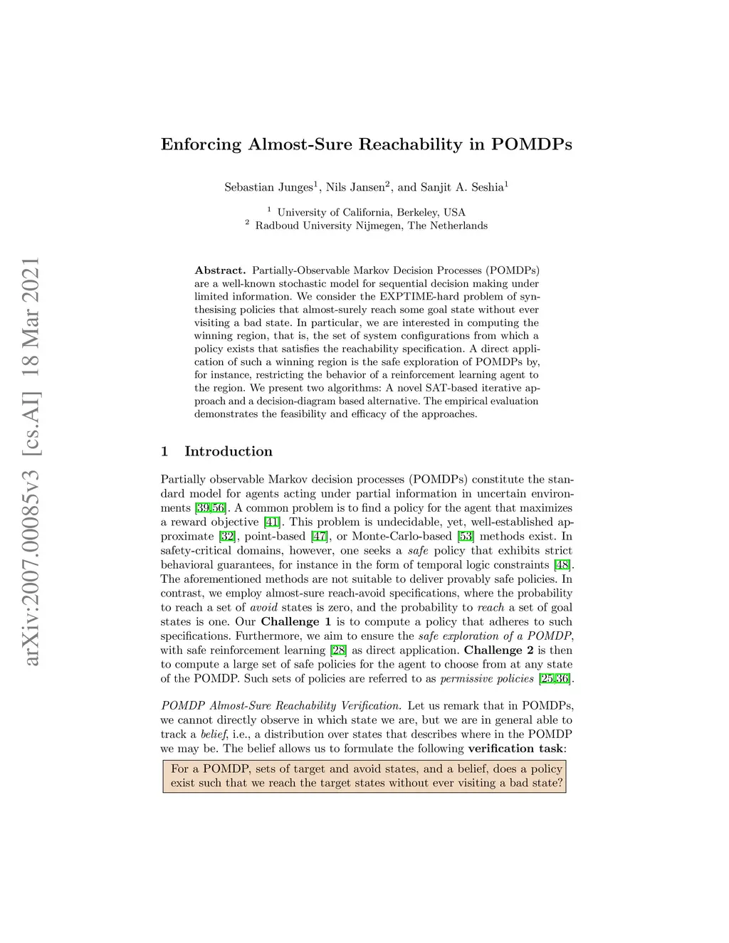 Partially-Observable Markov Decision Processes (POMDPs) are a well-known stochastic model for sequential decision making under limited information. We consider the EXPTIME-hard problem of synthesising policies that almost-surely reach some goal state without ever visiting a bad state. In particular, we are interested in computing the winning region, that is, the set of system configurations from which a policy exists that satisfies the reachability specification. A direct application of such a winning region is the safe exploration of POMDPs by, for instance, restricting the behavior of a reinforcement learning agent to the region. We present two algorithms: A novel SAT-based iterative approach and a decision-diagram based alternative. The empirical evaluation demonstrates the feasibility and efficacy of the approaches.