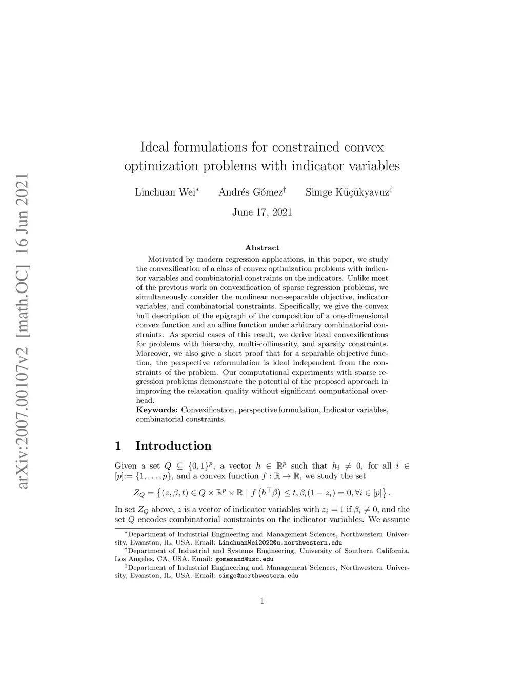Motivated by modern regression applications, in this paper, we study the convexification of a class of convex optimization problems with indicator variables and combinatorial constraints on the indicators. Unlike most of the previous work on convexification of sparse regression problems, we simultaneously consider the nonlinear non-separable objective, indicator variables, and combinatorial constraints. Specifically, we give the convex hull description of the epigraph of the composition of a one-dimensional convex function and an affine function under arbitrary combinatorial constraints. As special cases of this result, we derive ideal convexifications for problems with hierarchy, multi-collinearity, and sparsity constraints. Moreover, we also give a short proof that for a separable objective function, the perspective reformulation is ideal independent from the constraints of the problem. Our computational experiments with regression problems under hierarchy constraints on real datasets demonstrate the potential of the proposed approach in improving the relaxation quality without significant computational overhead.