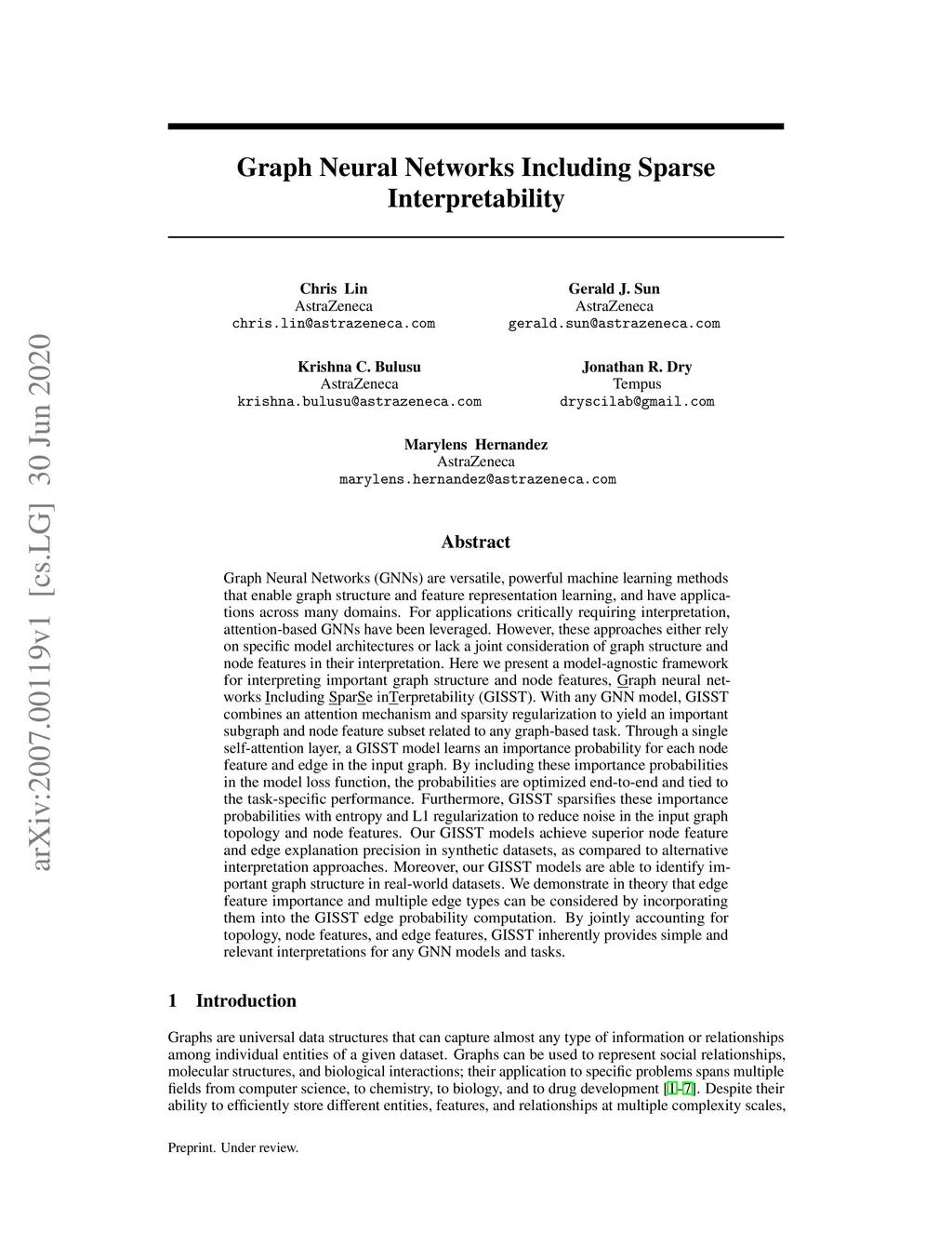 Graph Neural Networks (GNNs) are versatile, powerful machine learning methods that enable graph structure and feature representation learning, and have applications across many domains. For applications critically requiring interpretation, attention-based GNNs have been leveraged. However, these approaches either rely on specific model architectures or lack a joint consideration of graph structure and node features in their interpretation. Here we present a model-agnostic framework for interpreting important graph structure and node features, Graph neural networks Including SparSe inTerpretability (GISST). With any GNN model, GISST combines an attention mechanism and sparsity regularization to yield an important subgraph and node feature subset related to any graph-based task. Through a single self-attention layer, a GISST model learns an importance probability for each node feature and edge in the input graph. By including these importance probabilities in the model loss function, the probabilities are optimized end-to-end and tied to the task-specific performance. Furthermore, GISST sparsifies these importance probabilities with entropy and L1 regularization to reduce noise in the input graph topology and node features. Our GISST models achieve superior node feature and edge explanation precision in synthetic datasets, as compared to alternative interpretation approaches. Moreover, our GISST models are able to identify important graph structure in real-world datasets. We demonstrate in theory that edge feature importance and multiple edge types can be considered by incorporating them into the GISST edge probability computation. By jointly accounting for topology, node features, and edge features, GISST inherently provides simple and relevant interpretations for any GNN models and tasks.