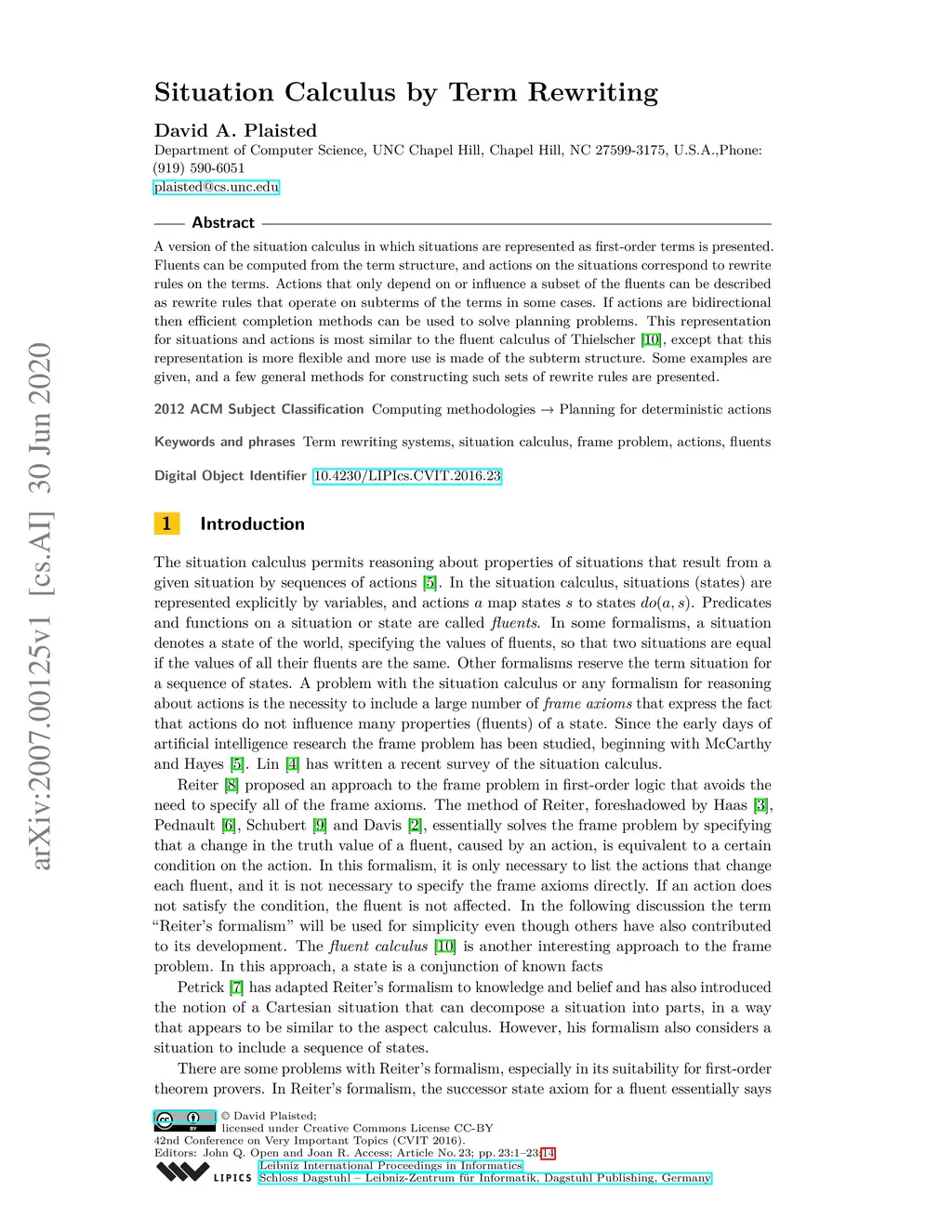 A version of the situation calculus in which situations are represented as first-order terms is presented. Fluents can be computed from the term structure, and actions on the situations correspond to rewrite rules on the terms. Actions that only depend on or influence a subset of the fluents can be described as rewrite rules that operate on subterms of the terms in some cases. If actions are bidirectional then efficient completion methods can be used to solve planning problems. This representation for situations and actions is most similar to the fluent calculus of Thielscher \cite{Thielscher98}, except that this representation is more flexible and more use is made of the subterm structure. Some examples are given, and a few general methods for constructing such sets of rewrite rules are presented. This paper was submitted to FSCD 2020 on December 23, 2019.