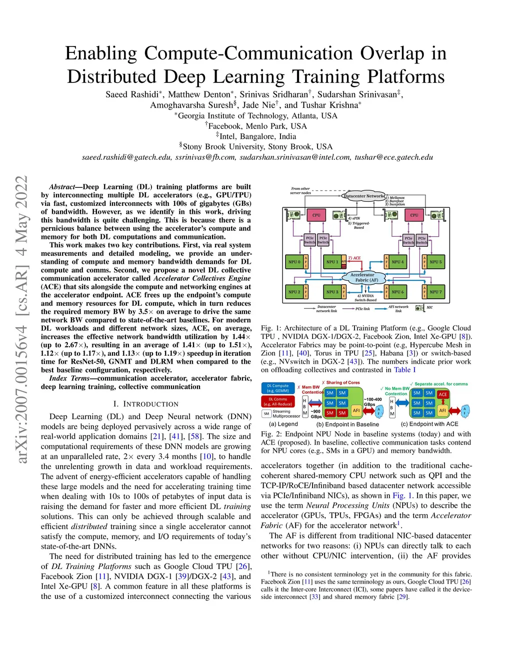 Deep Learning (DL) training platforms are built by interconnecting multiple DL accelerators (e.g., GPU/TPU) via fast, customized interconnects with 100s of gigabytes (GBs) of bandwidth. However, as we identify in this work, driving this bandwidth is quite challenging. This is because there is a pernicious balance between using the accelerator's compute and memory for both DL computations and communication. This work makes two key contributions. First, via real system measurements and detailed modeling, we provide an understanding of compute and memory bandwidth demands for DL compute and comms. Second, we propose a novel DL collective communication accelerator called Accelerator Collectives Engine (ACE) that sits alongside the compute and networking engines at the accelerator endpoint. ACE frees up the endpoint's compute and memory resources for DL compute, which in turn reduces the required memory BW by 3.5X on average to drive the same network BW compared to state-of-the-art baselines. For modern DL workloads and different network sizes, ACE, on average, increases the effective network bandwidth utilization by 1.44X (up to 2.67X), resulting in an average of 1.41X (up to 1.51X), 1.12X (up to 1.17X), and 1.13X (up to 1.19X) speedup in iteration time for ResNet-50, GNMT and DLRM when compared to the best baseline configuration, respectively.