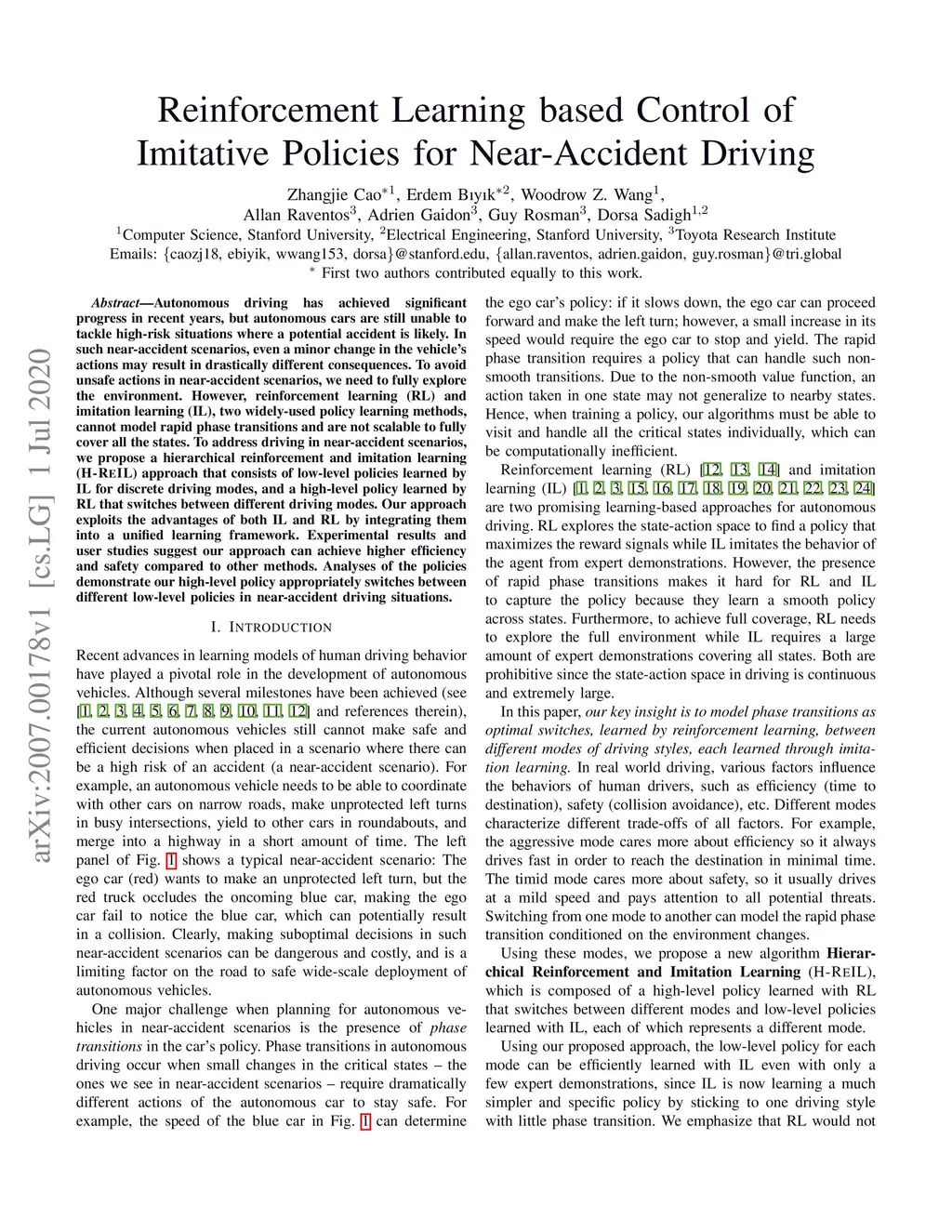 Autonomous driving has achieved significant progress in recent years, but autonomous cars are still unable to tackle high-risk situations where a potential accident is likely. In such near-accident scenarios, even a minor change in the vehicle's actions may result in drastically different consequences. To avoid unsafe actions in near-accident scenarios, we need to fully explore the environment. However, reinforcement learning (RL) and imitation learning (IL), two widely-used policy learning methods, cannot model rapid phase transitions and are not scalable to fully cover all the states. To address driving in near-accident scenarios, we propose a hierarchical reinforcement and imitation learning (H-ReIL) approach that consists of low-level policies learned by IL for discrete driving modes, and a high-level policy learned by RL that switches between different driving modes. Our approach exploits the advantages of both IL and RL by integrating them into a unified learning framework. Experimental results and user studies suggest our approach can achieve higher efficiency and safety compared to other methods. Analyses of the policies demonstrate our high-level policy appropriately switches between different low-level policies in near-accident driving situations.