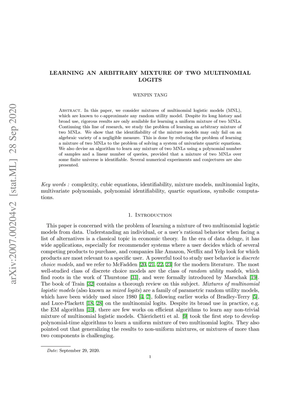 In this paper, we consider mixtures of multinomial logistic models (MNL), which are known to -approximate any random utility model. Despite its long history and broad use, rigorous results are only available for learning a uniform mixture of two MNLs. Continuing this line of research, we study the problem of learning an arbitrary mixture of two MNLs. We show that the identifiability of the mixture models may only fail on an algebraic variety of a negligible measure. This is done by reducing the problem of learning a mixture of two MNLs to the problem of solving a system of univariate quartic equations. We also devise an algorithm to learn any mixture of two MNLs using a polynomial number of samples and a linear number of queries, provided that a mixture of two MNLs over some finite universe is identifiable. Several numerical experiments and conjectures are also presented.