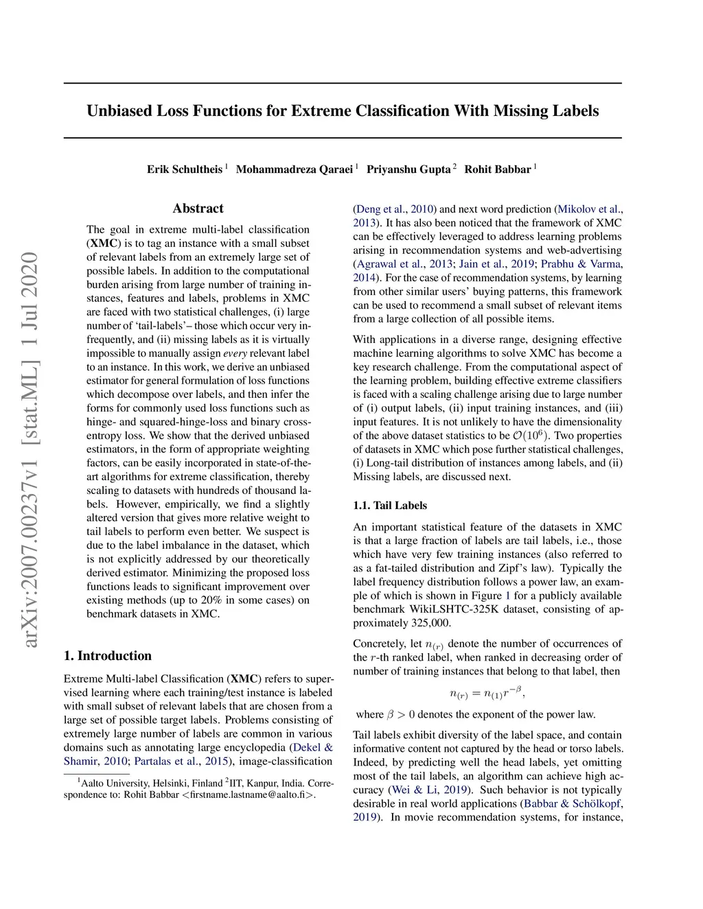Unbiased Loss Functions for Extreme Classification With Missing Labels
