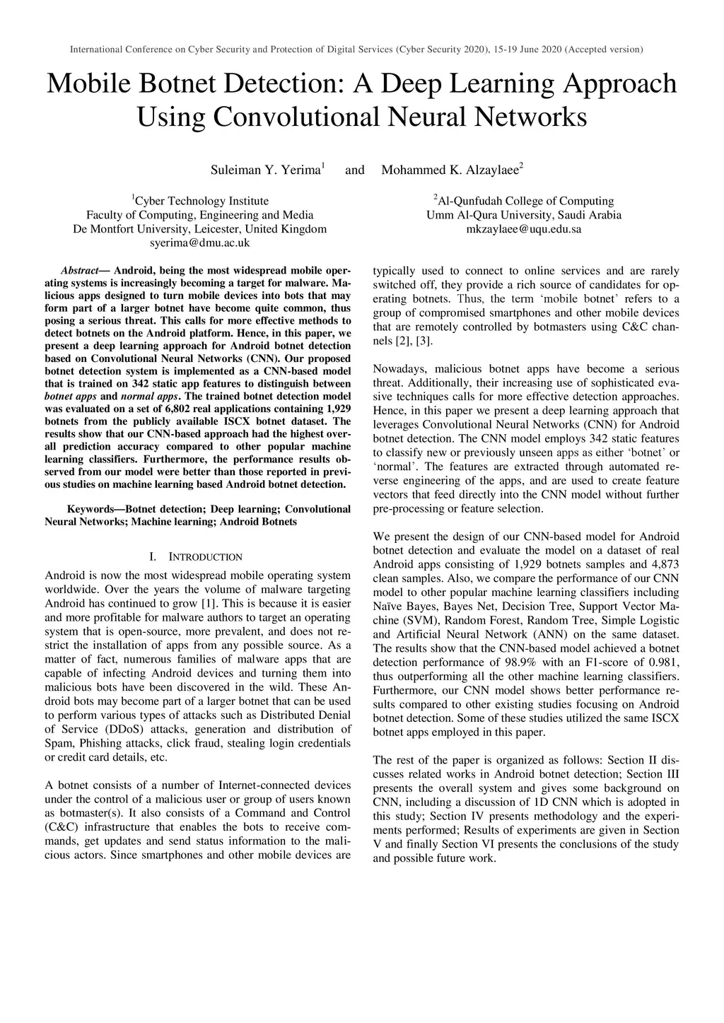 Mobile Botnet Detection: A Deep Learning Approach Using Convolutional