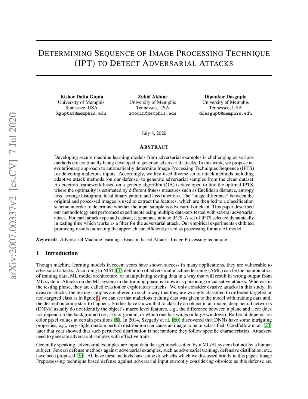 Developing secure machine learning models from adversarial examples is challenging as various methods are continually being developed to generate adversarial attacks. In this work, we propose an evolutionary approach to automatically determine Image Processing Techniques Sequence (IPTS) for detecting malicious inputs. Accordingly, we first used a diverse set of attack methods including adaptive attack methods (on our defense) to generate adversarial samples from the clean dataset. A detection framework based on a genetic algorithm (GA) is developed to find the optimal IPTS, where the optimality is estimated by different fitness measures such as Euclidean distance, entropy loss, average histogram, local binary pattern and loss functions. The "image difference" between the original and processed images is used to extract the features, which are then fed to a classification scheme in order to determine whether the input sample is adversarial or clean. This paper described our methodology and performed experiments using multiple data-sets tested with several adversarial attacks. For each attack-type and dataset, it generates unique IPTS. A set of IPTS selected dynamically in testing time which works as a filter for the adversarial attack. Our empirical experiments exhibited promising results indicating the approach can efficiently be used as processing for any AI model.