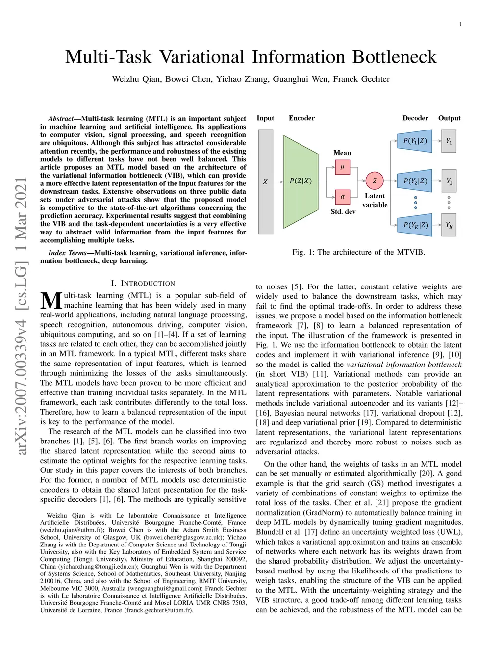 Multi-task learning (MTL) is an important subject in machine learning and artificial intelligence. Its applications to computer vision, signal processing, and speech recognition are ubiquitous. Although this subject has attracted considerable attention recently, the performance and robustness of the existing models to different tasks have not been well balanced. This article proposes an MTL model based on the architecture of the variational information bottleneck (VIB), which can provide a more effective latent representation of the input features for the downstream tasks. Extensive observations on three public data sets under adversarial attacks show that the proposed model is competitive to the state-of-the-art algorithms concerning the prediction accuracy. Experimental results suggest that combining the VIB and the task-dependent uncertainties is a very effective way to abstract valid information from the input features for accomplishing multiple tasks.