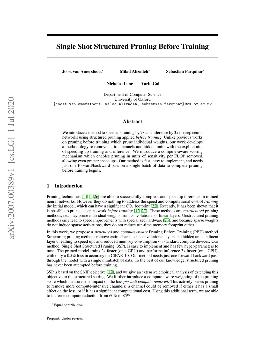 We introduce a method to speed up training by 2x and inference by 3x in deep neural networks using structured pruning applied before training. Unlike previous works on pruning before training which prune individual weights, our work develops a methodology to remove entire channels and hidden units with the explicit aim of speeding up training and inference. We introduce a compute-aware scoring mechanism which enables pruning in units of sensitivity per FLOP removed, allowing even greater speed ups. Our method is fast, easy to implement, and needs just one forward/backward pass on a single batch of data to complete pruning before training begins.