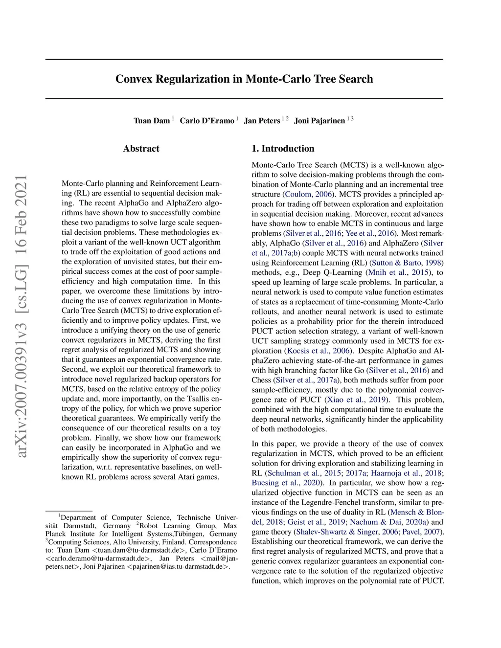 Monte-Carlo planning and Reinforcement Learning (RL) are essential to sequential decision making. The recent AlphaGo and AlphaZero algorithms have shown how to successfully combine these two paradigms in order to solve large scale sequential decision problems. These methodologies exploit a variant of the well-known UCT algorithm to trade off exploitation of good actions and exploration of unvisited states, but their empirical success comes at the cost of poor sample-efficiency and high computation time. In this paper, we overcome these limitations by considering convex regularization in Monte-Carlo Tree Search (MCTS), which has been successfully used in RL to efficiently drive exploration. First, we introduce a unifying theory on the use of generic convex regularizers in MCTS, deriving the regret analysis and providing guarantees of exponential convergence rate. Second, we exploit our theoretical framework to introduce novel regularized backup operators for MCTS, based on the relative entropy of the policy update, and on the Tsallis entropy of the policy. Finally, we empirically evaluate the proposed operators in AlphaGo and AlphaZero on problems of increasing dimensionality and branching factor, from a toy problem to several Atari games, showing their superiority w.r.t. representative baselines.