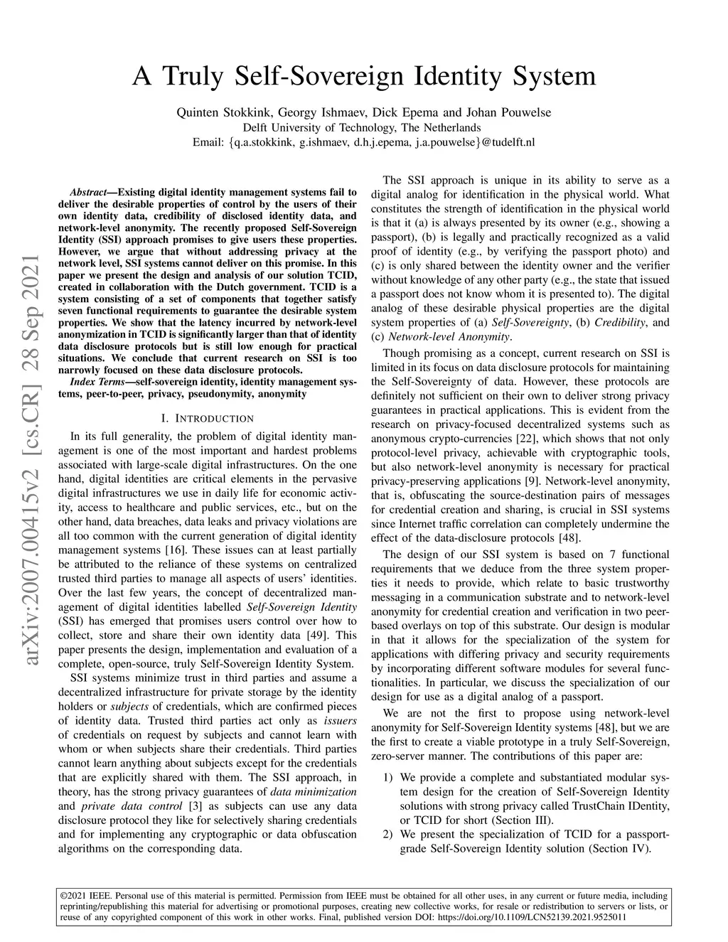 Existing digital identity management systems fail to deliver the desirable properties of control by the users of their own identity data, credibility of disclosed identity data, and network-level anonymity. The recently proposed Self-Sovereign Identity (SSI) approach promises to give users these properties. However, we argue that without addressing privacy at the network level, SSI systems cannot deliver on this promise. In this paper we present the design and analysis of our solution TCID, created in collaboration with the Dutch government. TCID is a system consisting of a set of components that together satisfy seven functional requirements to guarantee the desirable system properties. We show that the latency incurred by network-level anonymization in TCID is significantly larger than that of identity data disclosure protocols but is still low enough for practical situations. We conclude that current research on SSI is too narrowly focused on these data disclosure protocols.