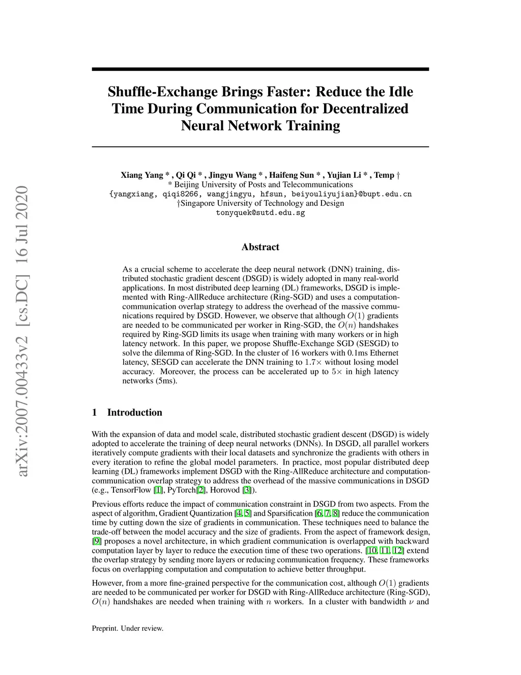 As a crucial scheme to accelerate the deep neural network (DNN) training, distributed stochastic gradient descent (DSGD) is widely adopted in many real-world applications. In most distributed deep learning (DL) frameworks, DSGD is implemented with Ring-AllReduce architecture (Ring-SGD) and uses a computation-communication overlap strategy to address the overhead of the massive communications required by DSGD. However, we observe that although gradients are needed to be communicated per worker in Ring-SGD, the handshakes required by Ring-SGD limits its usage when training with many workers or in high latency network. In this paper, we propose Shuffle-Exchange SGD (SESGD) to solve the dilemma of Ring-SGD. In the cluster of 16 workers with 0.1ms Ethernet latency, SESGD can accelerate the DNN training to without losing model accuracy. Moreover, the process can be accelerated up to in high latency networks (5ms).
