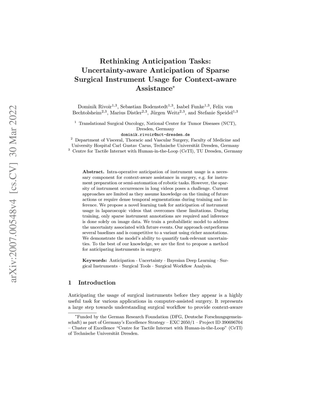 Intra-operative anticipation of instrument usage is a necessary component for context-aware assistance in surgery, e.g. for instrument preparation or semi-automation of robotic tasks. However, the sparsity of instrument occurrences in long videos poses a challenge. Current approaches are limited as they assume knowledge on the timing of future actions or require dense temporal segmentations during training and inference. We propose a novel learning task for anticipation of instrument usage in laparoscopic videos that overcomes these limitations. During training, only sparse instrument annotations are required and inference is done solely on image data. We train a probabilistic model to address the uncertainty associated with future events. Our approach outperforms several baselines and is competitive to a variant using richer annotations. We demonstrate the model's ability to quantify task-relevant uncertainties. To the best of our knowledge, we are the first to propose a method for anticipating instruments in surgery.