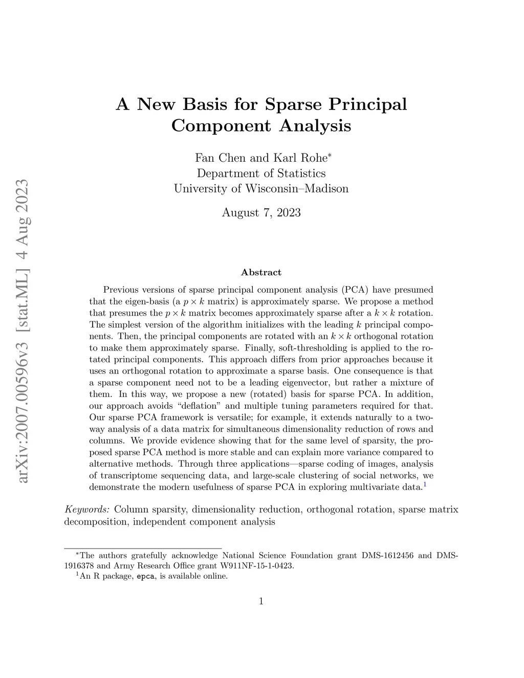 Previous versions of sparse principal component analysis (PCA) have presumed that the eigen-basis (a matrix) is approximately sparse. We propose a method that presumes the matrix becomes approximately sparse after a rotation. The simplest version of the algorithm initializes with the leading principal components. Then, the principal components are rotated with an orthogonal rotation to make them approximately sparse. Finally, soft-thresholding is applied to the rotated principal components. This approach differs from prior approaches because it uses an orthogonal rotation to approximate a sparse basis. One consequence is that a sparse component need not to be a leading eigenvector, but rather a mixture of them. In this way, we propose a new (rotated) basis for sparse PCA. In addition, our approach avoids "deflation" and multiple tuning parameters required for that. Our sparse PCA framework is versatile; for example, it extends naturally to a two-way analysis of a data matrix for simultaneous dimensionality reduction of rows and columns. We provide evidence showing that for the same level of sparsity, the proposed sparse PCA method is more stable and can explain more variance compared to alternative methods. Through three applications -- sparse coding of images, analysis of transcriptome sequencing data, and large-scale clustering of social networks, we demonstrate the modern usefulness of sparse PCA in exploring multivariate data.