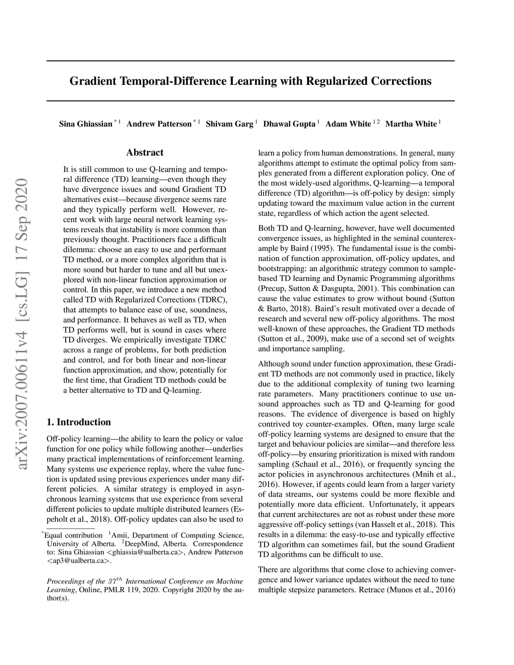 It is still common to use Q-learning and temporal difference (TD) learning-even though they have divergence issues and sound Gradient TD alternatives exist-because divergence seems rare and they typically perform well. However, recent work with large neural network learning systems reveals that instability is more common than previously thought. Practitioners face a difficult dilemma: choose an easy to use and performant TD method, or a more complex algorithm that is more sound but harder to tune and all but unexplored with non-linear function approximation or control. In this paper, we introduce a new method called TD with Regularized Corrections (TDRC), that attempts to balance ease of use, soundness, and performance. It behaves as well as TD, when TD performs well, but is sound in cases where TD diverges. We empirically investigate TDRC across a range of problems, for both prediction and control, and for both linear and non-linear function approximation, and show, potentially for the first time, that gradient TD methods could be a better alternative to TD and Q-learning.