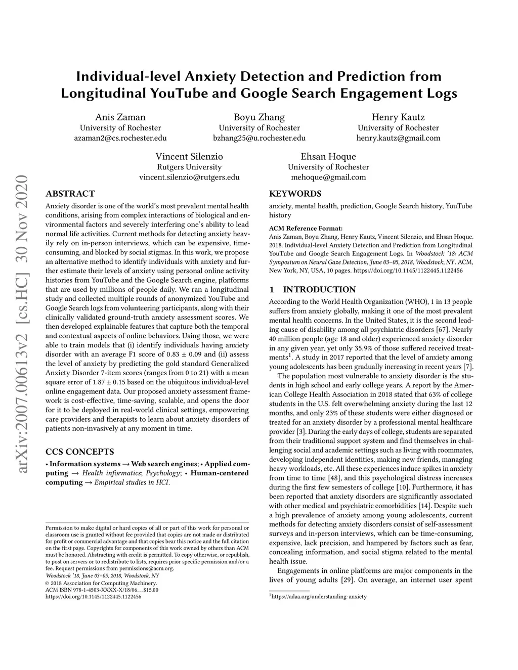 Anxiety disorder is one of the world's most prevalent mental health conditions, arising from complex interactions of biological and environmental factors and severely interfering one's ability to lead normal life activities. Current methods for detecting anxiety heavily rely on in-person interviews, which can be expensive, time-consuming, and blocked by social stigmas. In this work, we propose an alternative method to identify individuals with anxiety and further estimate their levels of anxiety using personal online activity histories from YouTube and the Google Search engine, platforms that are used by millions of people daily. We ran a longitudinal study and collected multiple rounds of anonymized YouTube and Google Search logs from volunteering participants, along with their clinically validated ground-truth anxiety assessment scores. We then developed explainable features that capture both the temporal and contextual aspects of online behaviors. Using those, we were able to train models that (i) identify individuals having anxiety disorder with an average F1 score of 0.83 and (ii) assess the level of anxiety by predicting the gold standard Generalized Anxiety Disorder 7-item scores (ranges from 0 to 21) with a mean square error of 1.87 based on the ubiquitous individual-level online engagement data. Our proposed anxiety assessment framework is cost-effective, time-saving, scalable, and opens the door for it to be deployed in real-world clinical settings, empowering care providers and therapists to learn about anxiety disorders of patients non-invasively at any moment in time.