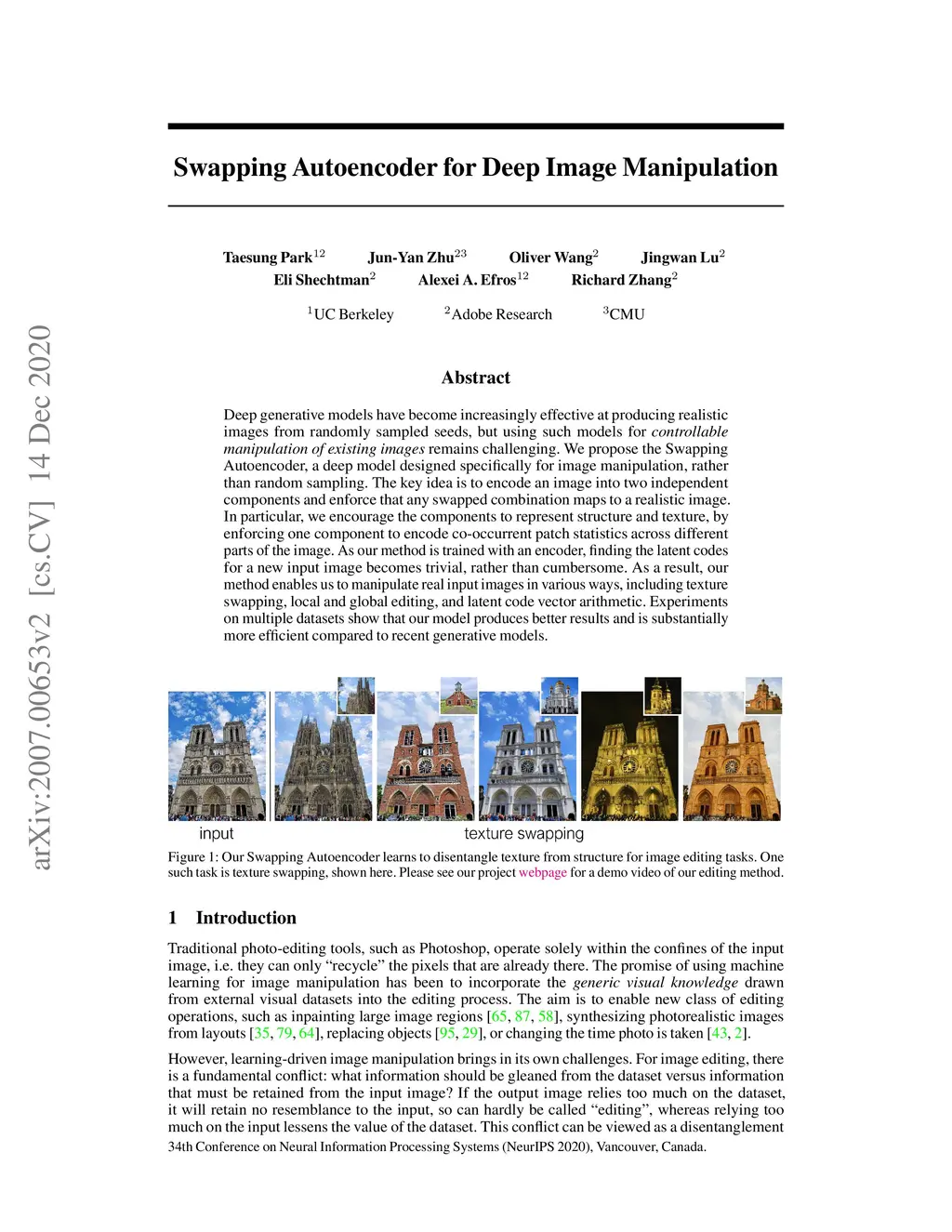 Deep generative models have become increasingly effective at producing realistic images from randomly sampled seeds, but using such models for controllable manipulation of existing images remains challenging. We propose the Swapping Autoencoder, a deep model designed specifically for image manipulation, rather than random sampling. The key idea is to encode an image with two independent components and enforce that any swapped combination maps to a realistic image. In particular, we encourage the components to represent structure and texture, by enforcing one component to encode co-occurrent patch statistics across different parts of an image. As our method is trained with an encoder, finding the latent codes for a new input image becomes trivial, rather than cumbersome. As a result, it can be used to manipulate real input images in various ways, including texture swapping, local and global editing, and latent code vector arithmetic. Experiments on multiple datasets show that our model produces better results and is substantially more efficient compared to recent generative models.