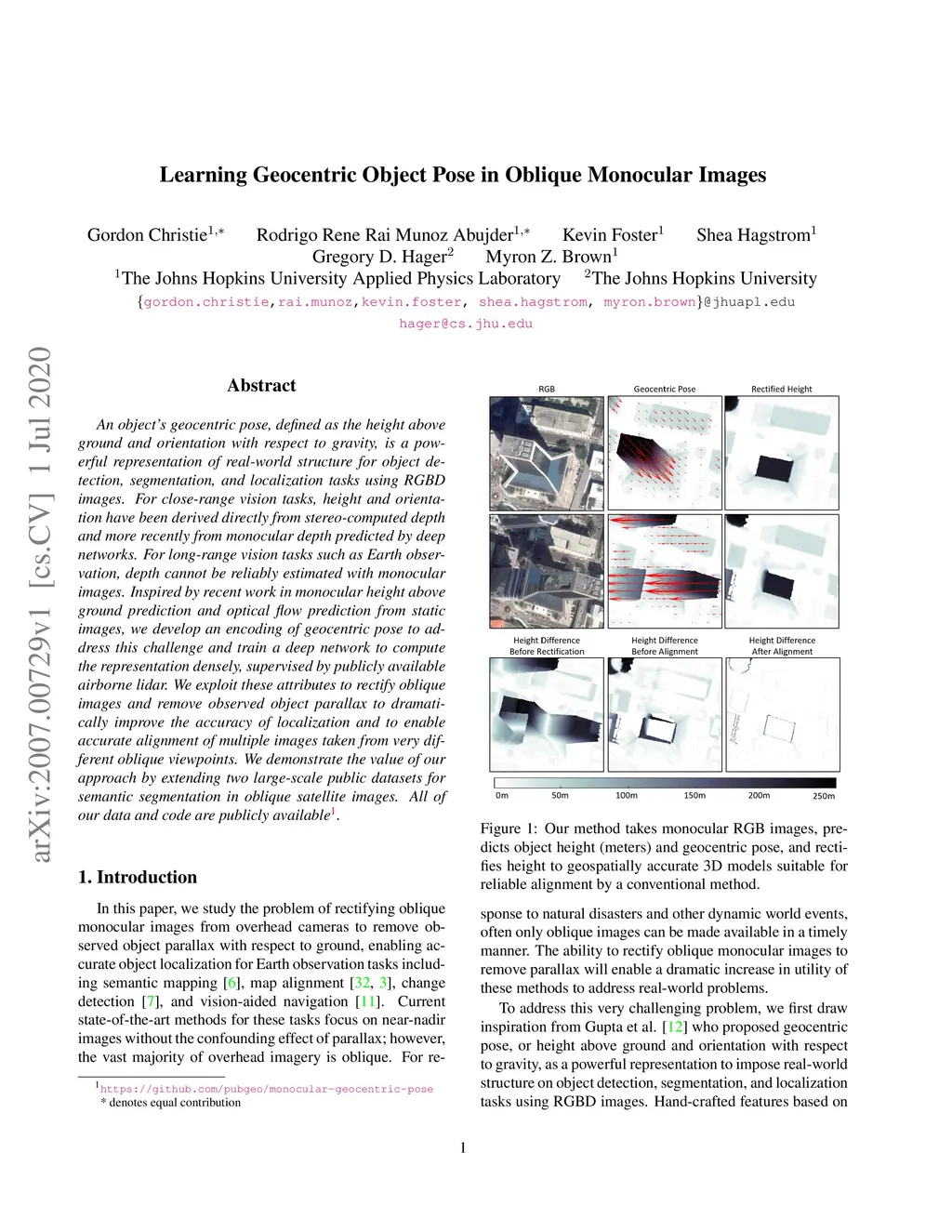 An object's geocentric pose, defined as the height above ground and orientation with respect to gravity, is a powerful representation of real-world structure for object detection, segmentation, and localization tasks using RGBD images. For close-range vision tasks, height and orientation have been derived directly from stereo-computed depth and more recently from monocular depth predicted by deep networks. For long-range vision tasks such as Earth observation, depth cannot be reliably estimated with monocular images. Inspired by recent work in monocular height above ground prediction and optical flow prediction from static images, we develop an encoding of geocentric pose to address this challenge and train a deep network to compute the representation densely, supervised by publicly available airborne lidar. We exploit these attributes to rectify oblique images and remove observed object parallax to dramatically improve the accuracy of localization and to enable accurate alignment of multiple images taken from very different oblique viewpoints. We demonstrate the value of our approach by extending two large-scale public datasets for semantic segmentation in oblique satellite images. All of our data and code are publicly available.