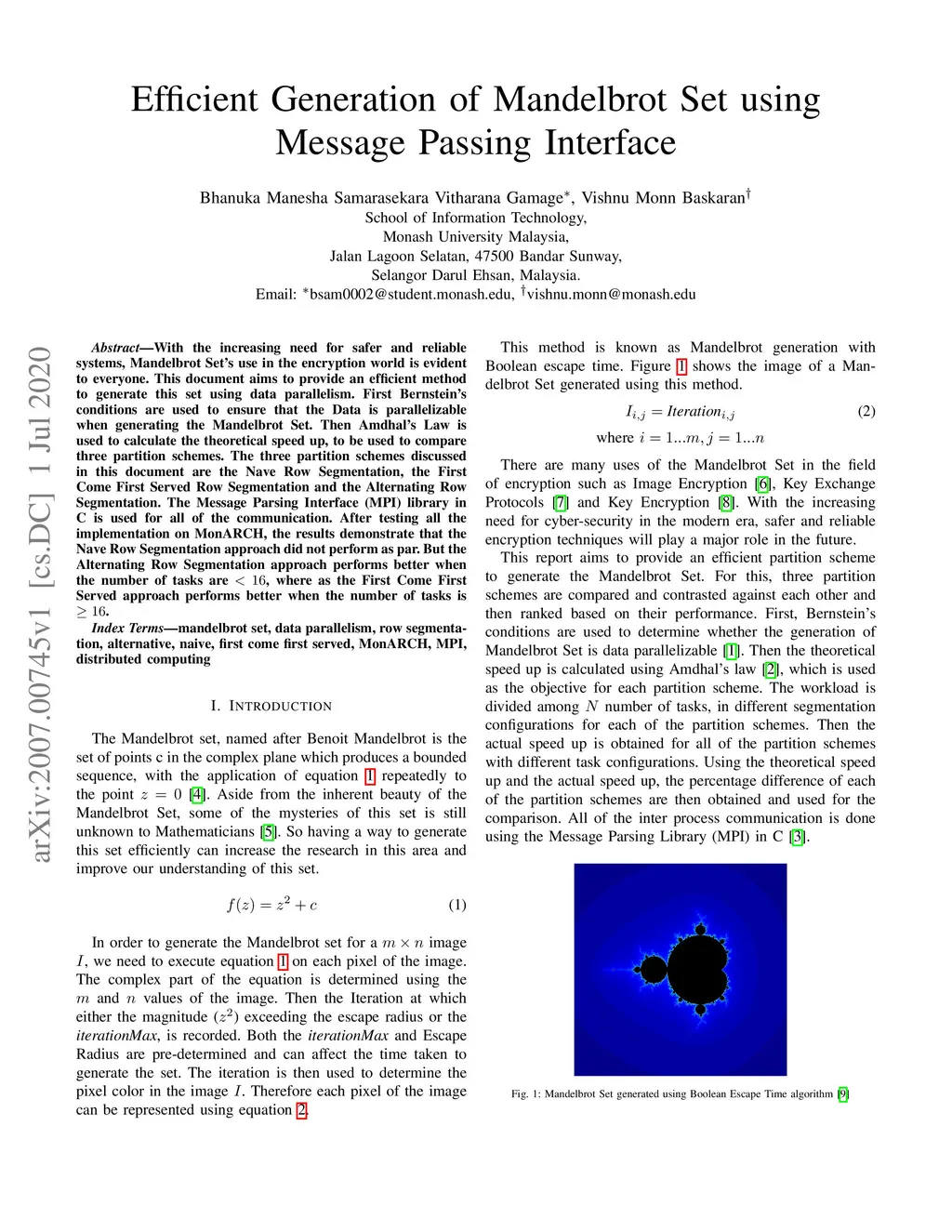 With the increasing need for safer and reliable systems, Mandelbrot Set's use in the encryption world is evident to everyone. This document aims to provide an efficient method to generate this set using data parallelism. First Bernstein's conditions are used to ensure that the Data is parallelizable when generating the Mandelbrot Set. Then Amdhal's Law is used to calculate the theoretical speed up, to be used to compare three partition schemes. The three partition schemes discussed in this document are the Na\"ive Row Segmentation, the First Come First Served Row Segmentation and the Alternating Row Segmentation. The Message Parsing Interface (MPI) library in C is used for all of the communication. After testing all the implementation on MonARCH, the results demonstrate that the Na\"ive Row Segmentation approach did not perform as par. But the Alternating Row Segmentation approach performs better when the number of tasks are , where as the First Come First Served approach performs better when the number of tasks is .
