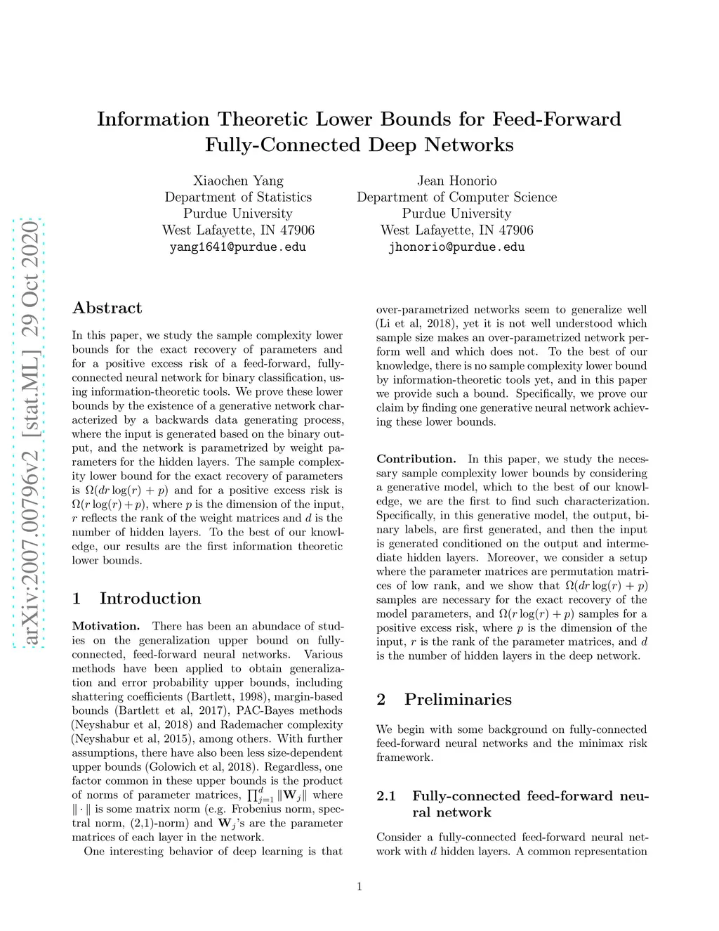 In this paper, we study the sample complexity lower bounds for the exact recovery of parameters and for a positive excess risk of a feed-forward, fully-connected neural network for binary classification, using information-theoretic tools. We prove these lower bounds by the existence of a generative network characterized by a backwards data generating process, where the input is generated based on the binary output, and the network is parametrized by weight parameters for the hidden layers. The sample complexity lower bound for the exact recovery of parameters is and for a positive excess risk is , where is the dimension of the input, reflects the rank of the weight matrices and is the number of hidden layers. To the best of our knowledge, our results are the first information theoretic lower bounds.