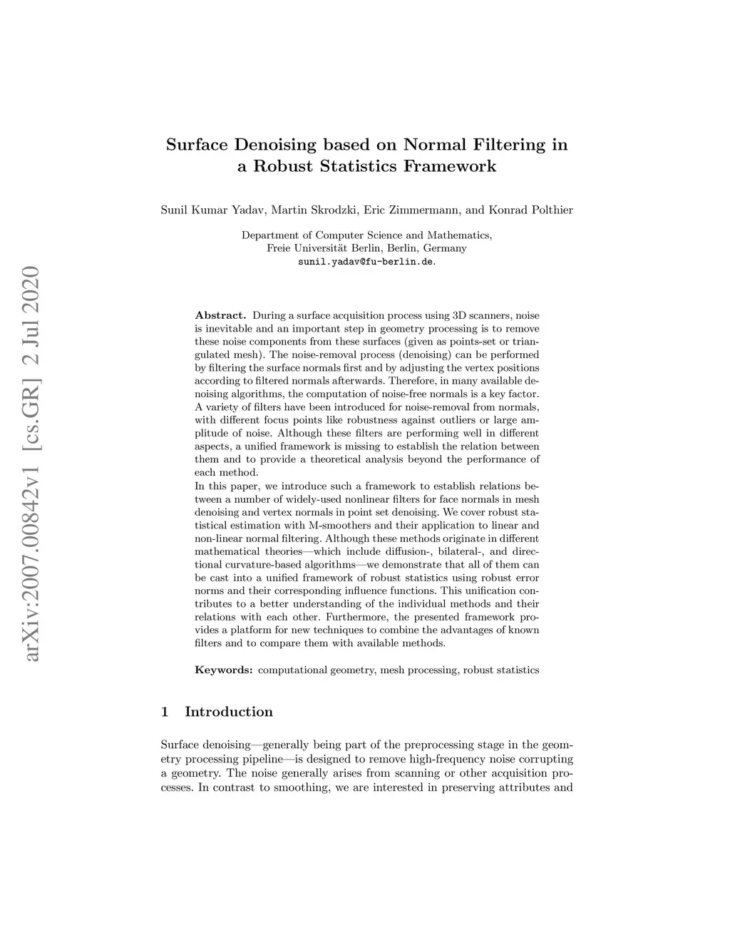 During a surface acquisition process using 3D scanners, noise is inevitable and an important step in geometry processing is to remove these noise components from these surfaces (given as points-set or triangulated mesh). The noise-removal process (denoising) can be performed by filtering the surface normals first and by adjusting the vertex positions according to filtered normals afterwards. Therefore, in many available denoising algorithms, the computation of noise-free normals is a key factor. A variety of filters have been introduced for noise-removal from normals, with different focus points like robustness against outliers or large amplitude of noise. Although these filters are performing well in different aspects, a unified framework is missing to establish the relation between them and to provide a theoretical analysis beyond the performance of each method. In this paper, we introduce such a framework to establish relations between a number of widely-used nonlinear filters for face normals in mesh denoising and vertex normals in point set denoising. We cover robust statistical estimation with M-smoothers and their application to linear and non-linear normal filtering. Although these methods originate in different mathematical theories - which include diffusion-, bilateral-, and directional curvature-based algorithms - we demonstrate that all of them can be cast into a unified framework of robust statistics using robust error norms and their corresponding influence functions. This unification contributes to a better understanding of the individual methods and their relations with each other. Furthermore, the presented framework provides a platform for new techniques to combine the advantages of known filters and to compare them with available methods.
