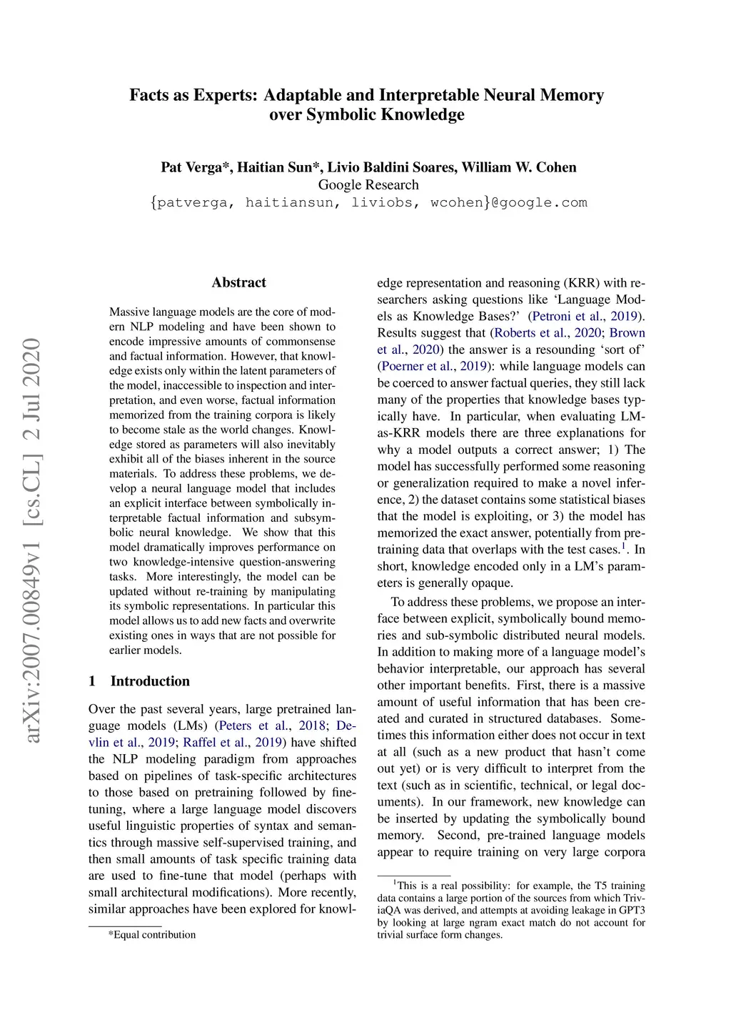 Massive language models are the core of modern NLP modeling and have been shown to encode impressive amounts of commonsense and factual information. However, that knowledge exists only within the latent parameters of the model, inaccessible to inspection and interpretation, and even worse, factual information memorized from the training corpora is likely to become stale as the world changes. Knowledge stored as parameters will also inevitably exhibit all of the biases inherent in the source materials. To address these problems, we develop a neural language model that includes an explicit interface between symbolically interpretable factual information and subsymbolic neural knowledge. We show that this model dramatically improves performance on two knowledge-intensive question-answering tasks. More interestingly, the model can be updated without re-training by manipulating its symbolic representations. In particular this model allows us to add new facts and overwrite existing ones in ways that are not possible for earlier models.