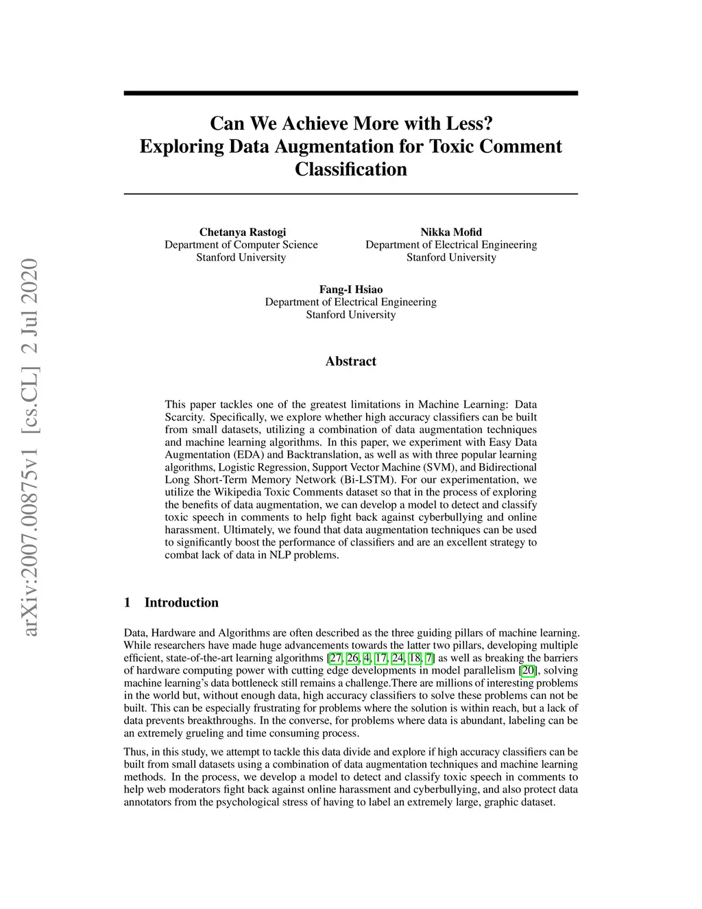 This paper tackles one of the greatest limitations in Machine Learning: Data Scarcity. Specifically, we explore whether high accuracy classifiers can be built from small datasets, utilizing a combination of data augmentation techniques and machine learning algorithms. In this paper, we experiment with Easy Data Augmentation (EDA) and Backtranslation, as well as with three popular learning algorithms, Logistic Regression, Support Vector Machine (SVM), and Bidirectional Long Short-Term Memory Network (Bi-LSTM). For our experimentation, we utilize the Wikipedia Toxic Comments dataset so that in the process of exploring the benefits of data augmentation, we can develop a model to detect and classify toxic speech in comments to help fight back against cyberbullying and online harassment. Ultimately, we found that data augmentation techniques can be used to significantly boost the performance of classifiers and are an excellent strategy to combat lack of data in NLP problems.