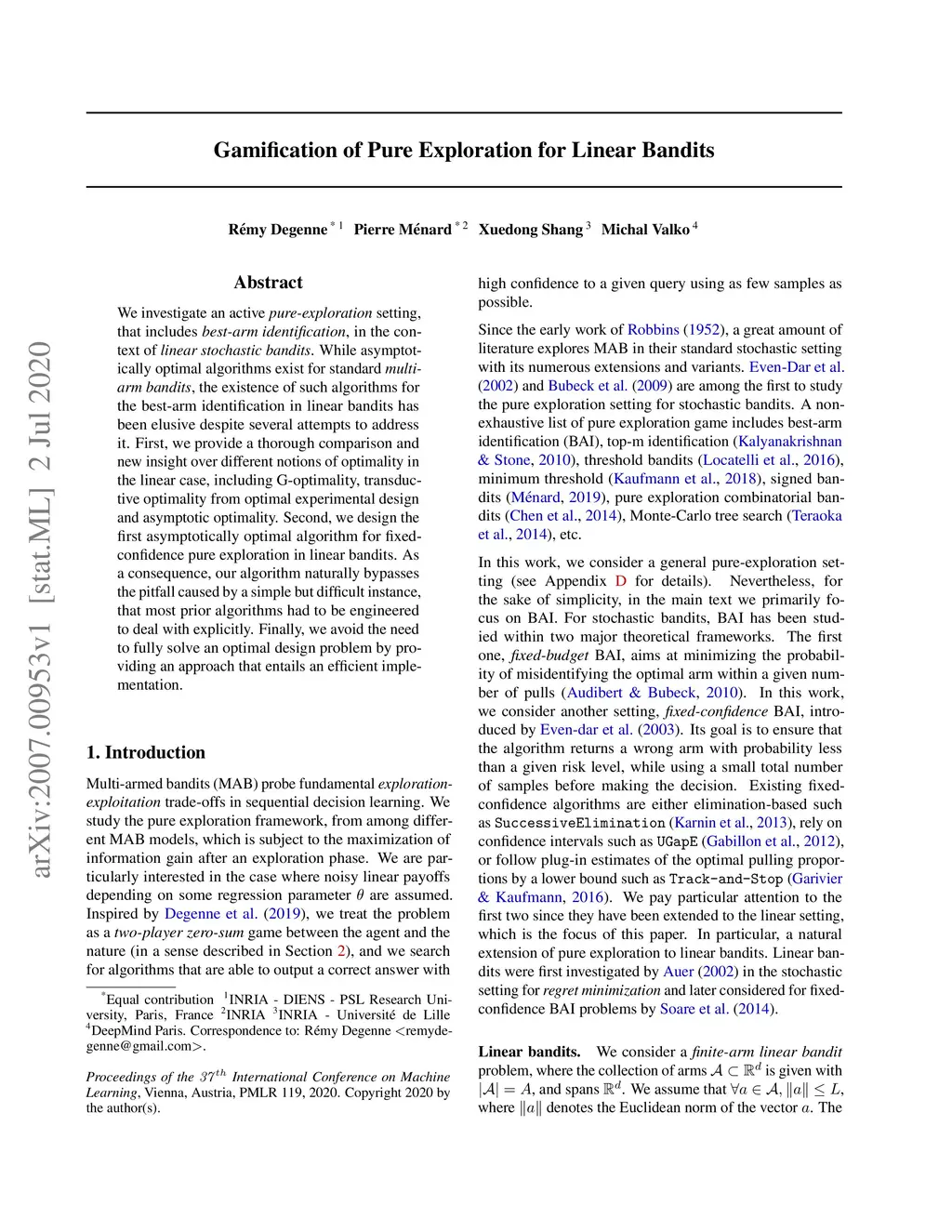 Gamification of Pure Exploration for Linear Bandits