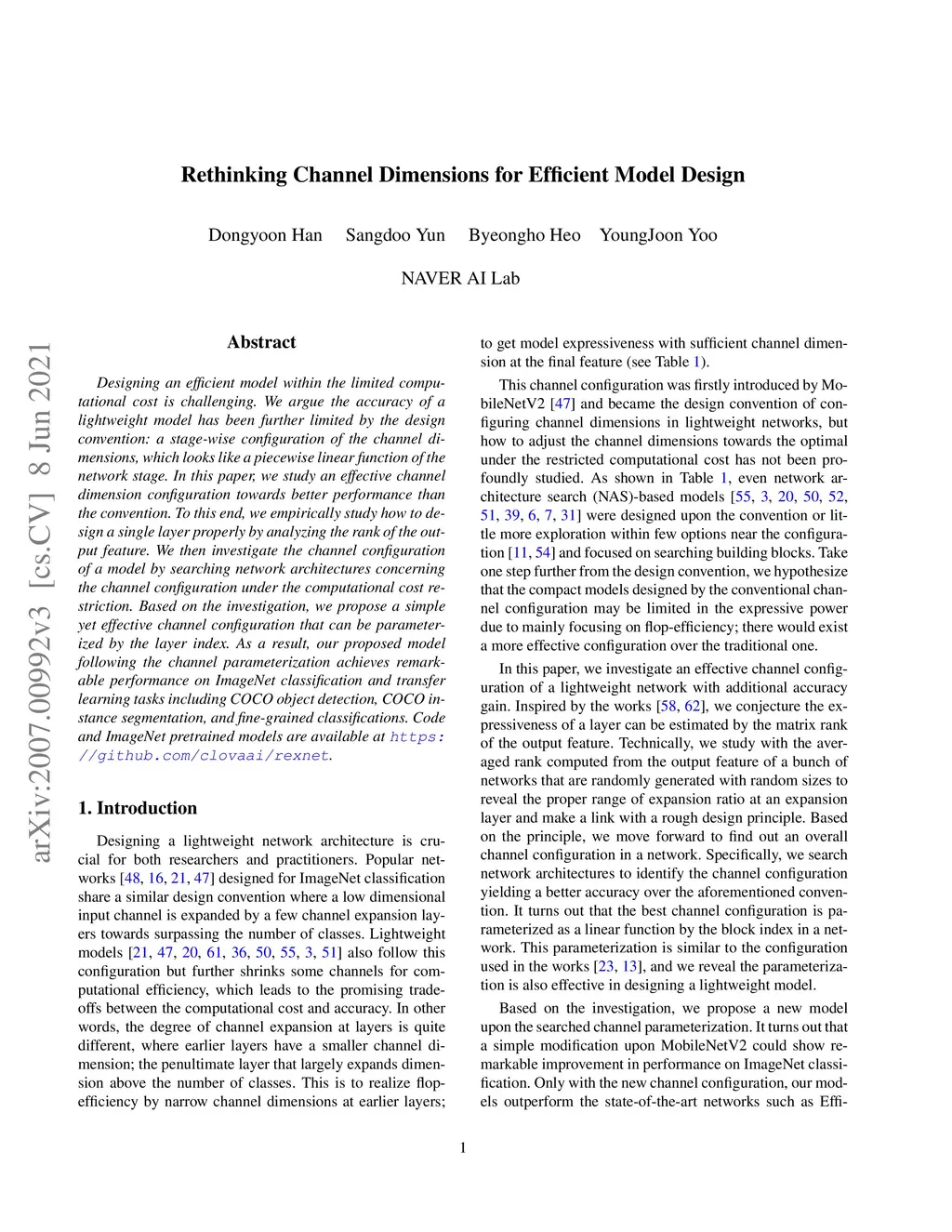 Designing an efficient model within the limited computational cost is challenging. We argue the accuracy of a lightweight model has been further limited by the design convention: a stage-wise configuration of the channel dimensions, which looks like a piecewise linear function of the network stage. In this paper, we study an effective channel dimension configuration towards better performance than the convention. To this end, we empirically study how to design a single layer properly by analyzing the rank of the output feature. We then investigate the channel configuration of a model by searching network architectures concerning the channel configuration under the computational cost restriction. Based on the investigation, we propose a simple yet effective channel configuration that can be parameterized by the layer index. As a result, our proposed model following the channel parameterization achieves remarkable performance on ImageNet classification and transfer learning tasks including COCO object detection, COCO instance segmentation, and fine-grained classifications. Code and ImageNet pretrained models are available at https://github.com/clovaai/rexnet.