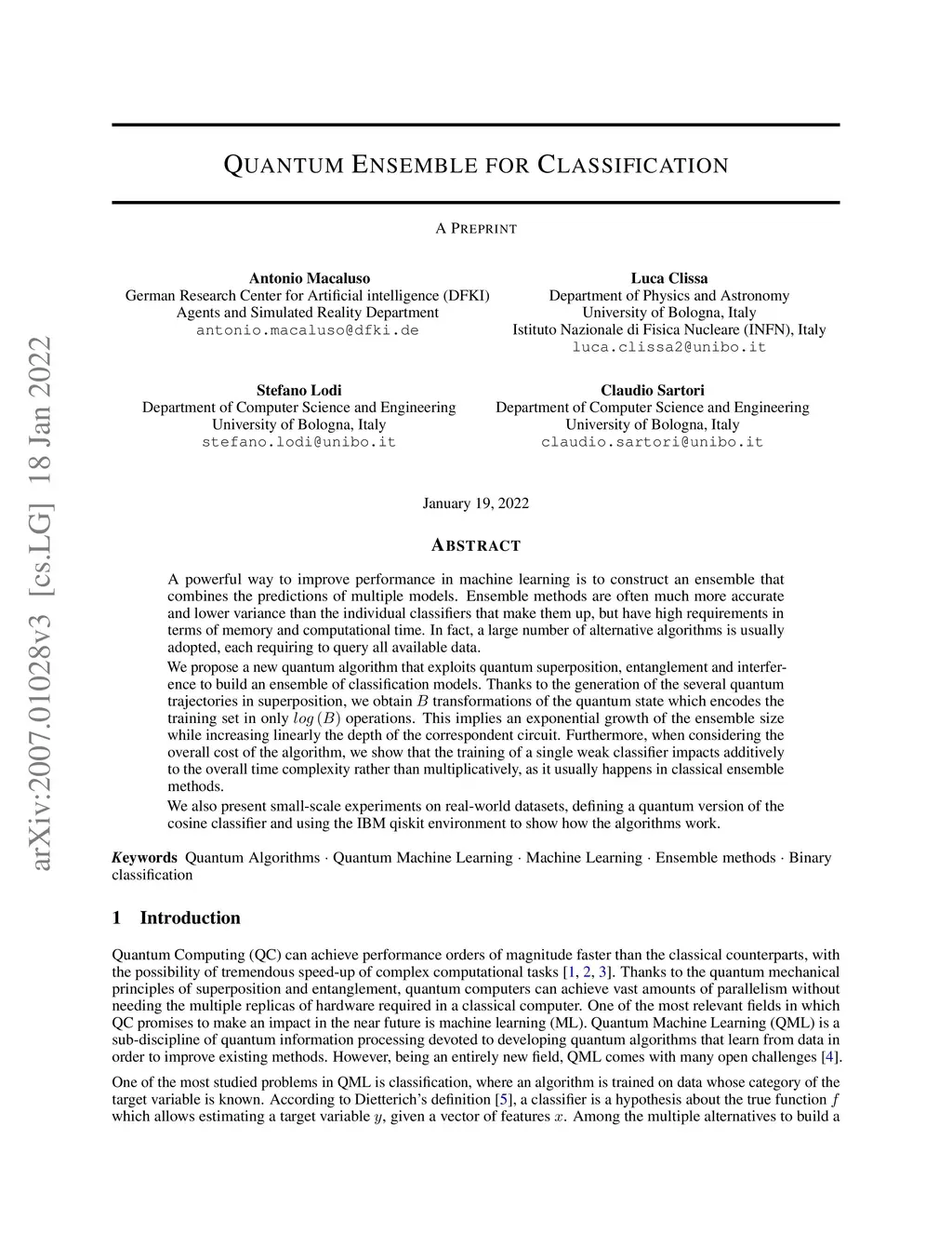 A powerful way to improve performance in machine learning is to construct an ensemble that combines the predictions of multiple models. Ensemble methods are often much more accurate and lower variance than the individual classifiers that make them up but have high requirements in terms of memory and computational time. In fact, a large number of alternative algorithms is usually adopted, each requiring to query all available data. We propose a new quantum algorithm that exploits quantum superposition, entanglement and interference to build an ensemble of classification models. Thanks to the generation of the several quantum trajectories in superposition, we obtain transformations of the quantum state which encodes the training set in only operations. This implies exponential growth of the ensemble size while increasing linearly the depth of the correspondent circuit. Furthermore, when considering the overall cost of the algorithm, we show that the training of a single weak classifier impacts additively the overall time complexity rather than multiplicatively, as it usually happens in classical ensemble methods. We also present small-scale experiments on real-world datasets, defining a quantum version of the cosine classifier and using the IBM qiskit environment to show how the algorithms work.