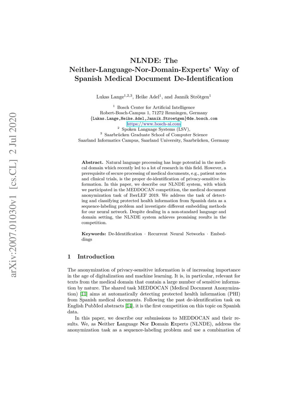 Natural language processing has huge potential in the medical domain which recently led to a lot of research in this field. However, a prerequisite of secure processing of medical documents, e.g., patient notes and clinical trials, is the proper de-identification of privacy-sensitive information. In this paper, we describe our NLNDE system, with which we participated in the MEDDOCAN competition, the medical document anonymization task of IberLEF 2019. We address the task of detecting and classifying protected health information from Spanish data as a sequence-labeling problem and investigate different embedding methods for our neural network. Despite dealing in a non-standard language and domain setting, the NLNDE system achieves promising results in the competition.