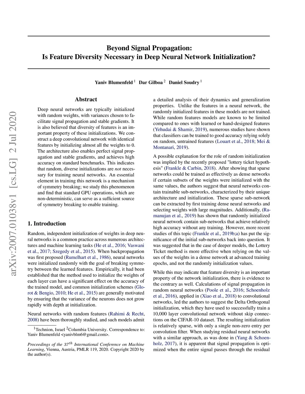 Deep neural networks are typically initialized with random weights, with variances chosen to facilitate signal propagation and stable gradients. It is also believed that diversity of features is an important property of these initializations. We construct a deep convolutional network with identical features by initializing almost all the weights to . The architecture also enables perfect signal propagation and stable gradients, and achieves high accuracy on standard benchmarks. This indicates that random, diverse initializations are \textit{not} necessary for training neural networks. An essential element in training this network is a mechanism of symmetry breaking; we study this phenomenon and find that standard GPU operations, which are non-deterministic, can serve as a sufficient source of symmetry breaking to enable training.