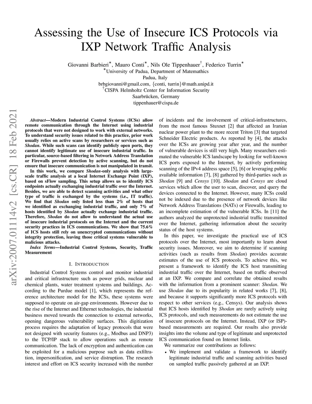 Modern Industrial Control Systems (ICSs) allow remote communication through the Internet using industrial protocols that were not designed to work with external networks. To understand security issues related to this practice, prior work usually relies on active scans by researchers or services such as Shodan. While such scans can identify publicly open ports, they cannot identify legitimate use of insecure industrial traffic. In particular, source-based filtering in Network Address Translation or Firewalls prevent detection by active scanning, but do not ensure that insecure communication is not manipulated in transit. In this work, we compare Shodan-only analysis with large-scale traffic analysis at a local Internet Exchange Point (IXP), based on sFlow sampling. This setup allows us to identify ICS endpoints actually exchanging industrial traffic over the Internet. Besides, we are able to detect scanning activities and what other type of traffic is exchanged by the systems (i.e., IT traffic). We find that Shodan only listed less than 2% of hosts that we identified as exchanging industrial traffic, and only 7% of hosts identified by Shodan actually exchange industrial traffic. Therefore, Shodan do not allow to understand the actual use of insecure industrial protocols on the Internet and the current security practices in ICS communications. We show that 75.6% of ICS hosts still rely on unencrypted communications without integrity protection, leaving those critical systems vulnerable to malicious attacks.