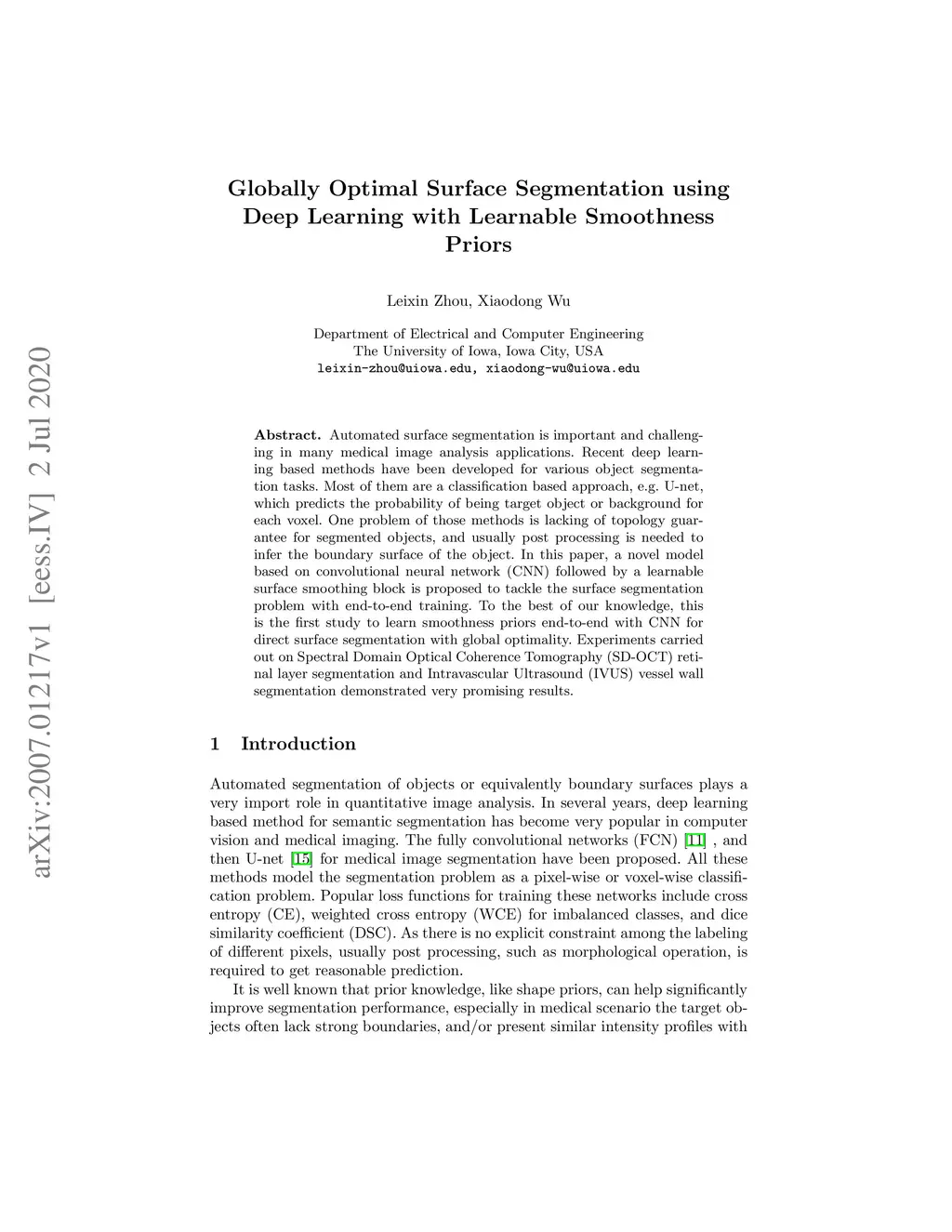 Automated surface segmentation is important and challenging in many medical image analysis applications. Recent deep learning based methods have been developed for various object segmentation tasks. Most of them are a classification based approach, e.g. U-net, which predicts the probability of being target object or background for each voxel. One problem of those methods is lacking of topology guarantee for segmented objects, and usually post processing is needed to infer the boundary surface of the object. In this paper, a novel model based on convolutional neural network (CNN) followed by a learnable surface smoothing block is proposed to tackle the surface segmentation problem with end-to-end training. To the best of our knowledge, this is the first study to learn smoothness priors end-to-end with CNN for direct surface segmentation with global optimality. Experiments carried out on Spectral Domain Optical Coherence Tomography (SD-OCT) retinal layer segmentation and Intravascular Ultrasound (IVUS) vessel wall segmentation demonstrated very promising results.