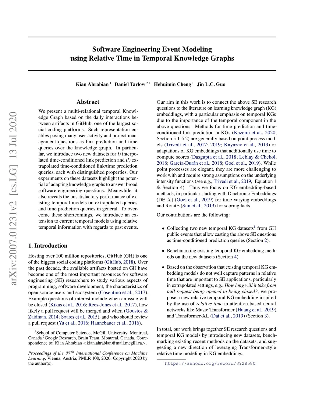 We present a multi-relational temporal Knowledge Graph based on the daily interactions between artifacts in GitHub, one of the largest social coding platforms. Such representation enables posing many user-activity and project management questions as link prediction and time queries over the knowledge graph. In particular, we introduce two new datasets for i) interpolated time-conditioned link prediction and ii) extrapolated time-conditioned link/time prediction queries, each with distinguished properties. Our experiments on these datasets highlight the potential of adapting knowledge graphs to answer broad software engineering questions. Meanwhile, it also reveals the unsatisfactory performance of existing temporal models on extrapolated queries and time prediction queries in general. To overcome these shortcomings, we introduce an extension to current temporal models using relative temporal information with regards to past events.
