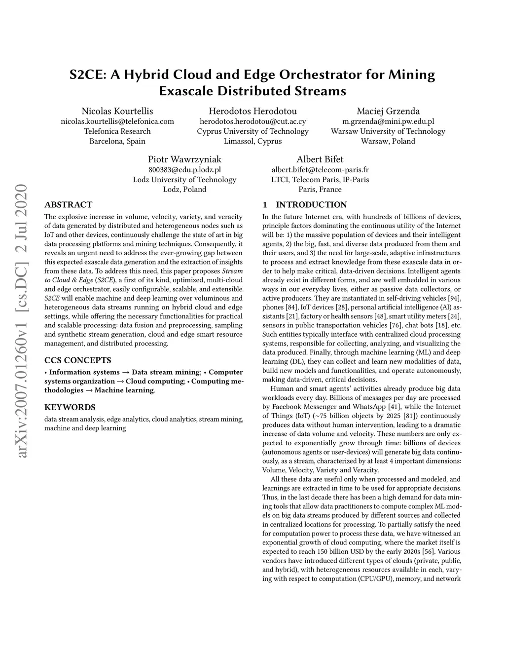 The explosive increase in volume, velocity, variety, and veracity of data generated by distributed and heterogeneous nodes such as IoT and other devices, continuously challenge the state of art in big data processing platforms and mining techniques. Consequently, it reveals an urgent need to address the ever-growing gap between this expected exascale data generation and the extraction of insights from these data. To address this need, this paper proposes Stream to Cloud & Edge (S2CE), a first of its kind, optimized, multi-cloud and edge orchestrator, easily configurable, scalable, and extensible. S2CE will enable machine and deep learning over voluminous and heterogeneous data streams running on hybrid cloud and edge settings, while offering the necessary functionalities for practical and scalable processing: data fusion and preprocessing, sampling and synthetic stream generation, cloud and edge smart resource management, and distributed processing.