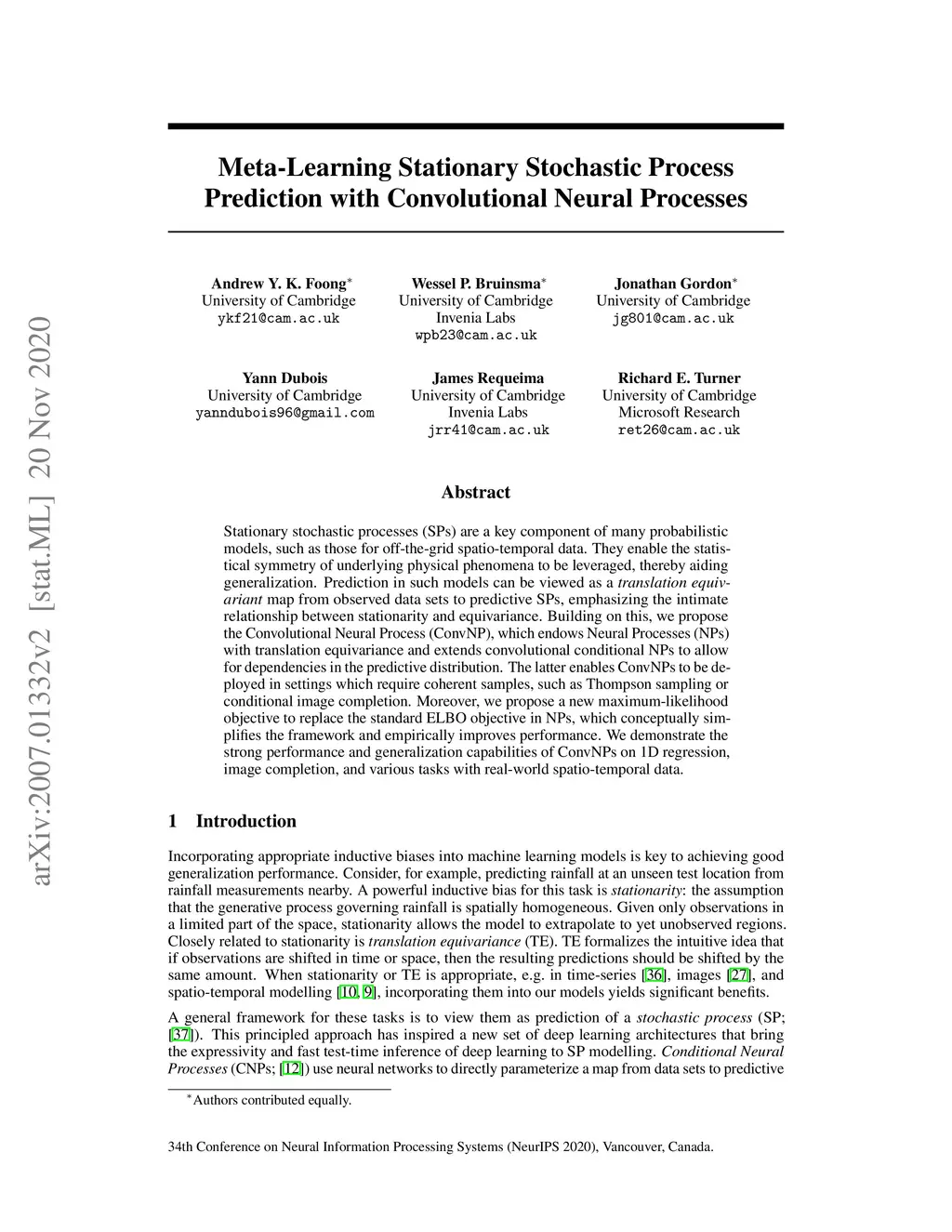 Stationary stochastic processes (SPs) are a key component of many probabilistic models, such as those for off-the-grid spatio-temporal data. They enable the statistical symmetry of underlying physical phenomena to be leveraged, thereby aiding generalization. Prediction in such models can be viewed as a translation equivariant map from observed data sets to predictive SPs, emphasizing the intimate relationship between stationarity and equivariance. Building on this, we propose the Convolutional Neural Process (ConvNP), which endows Neural Processes (NPs) with translation equivariance and extends convolutional conditional NPs to allow for dependencies in the predictive distribution. The latter enables ConvNPs to be deployed in settings which require coherent samples, such as Thompson sampling or conditional image completion. Moreover, we propose a new maximum-likelihood objective to replace the standard ELBO objective in NPs, which conceptually simplifies the framework and empirically improves performance. We demonstrate the strong performance and generalization capabilities of ConvNPs on 1D regression, image completion, and various tasks with real-world spatio-temporal data.