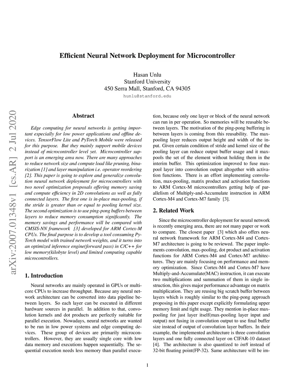 Edge computing for neural networks is getting important especially for low power applications and offline devices. TensorFlow Lite and PyTorch Mobile were released for this purpose. But they mainly support mobile devices instead of microcontroller level yet. Microcontroller support is an emerging area now. There are many approaches to reduce network size and compute load like pruning, binarization and layer manipulation i.e. operator reordering. This paper is going to explore and generalize convolution neural network deployment for microcontrollers with two novel optimization proposals offering memory saving and compute efficiency in 2D convolutions as well as fully connected layers. The first one is in-place max-pooling, if the stride is greater than or equal to pooling kernel size. The second optimization is to use ping-pong buffers between layers to reduce memory consumption significantly. The memory savings and performance will be compared with CMSIS-NN framework developed for ARM Cortex-M CPUs. The final purpose is to develop a tool consuming PyTorch model with trained network weights, and it turns into an optimized inference engine(forward pass) in C/C++ for low memory(kilobyte level) and limited computing capable microcontrollers.