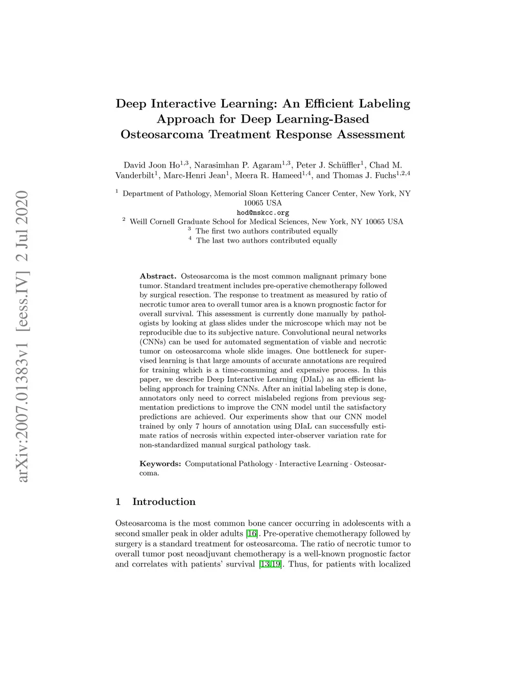 Osteosarcoma is the most common malignant primary bone tumor. Standard treatment includes pre-operative chemotherapy followed by surgical resection. The response to treatment as measured by ratio of necrotic tumor area to overall tumor area is a known prognostic factor for overall survival. This assessment is currently done manually by pathologists by looking at glass slides under the microscope which may not be reproducible due to its subjective nature. Convolutional neural networks (CNNs) can be used for automated segmentation of viable and necrotic tumor on osteosarcoma whole slide images. One bottleneck for supervised learning is that large amounts of accurate annotations are required for training which is a time-consuming and expensive process. In this paper, we describe Deep Interactive Learning (DIaL) as an efficient labeling approach for training CNNs. After an initial labeling step is done, annotators only need to correct mislabeled regions from previous segmentation predictions to improve the CNN model until the satisfactory predictions are achieved. Our experiments show that our CNN model trained by only 7 hours of annotation using DIaL can successfully estimate ratios of necrosis within expected inter-observer variation rate for non-standardized manual surgical pathology task.
