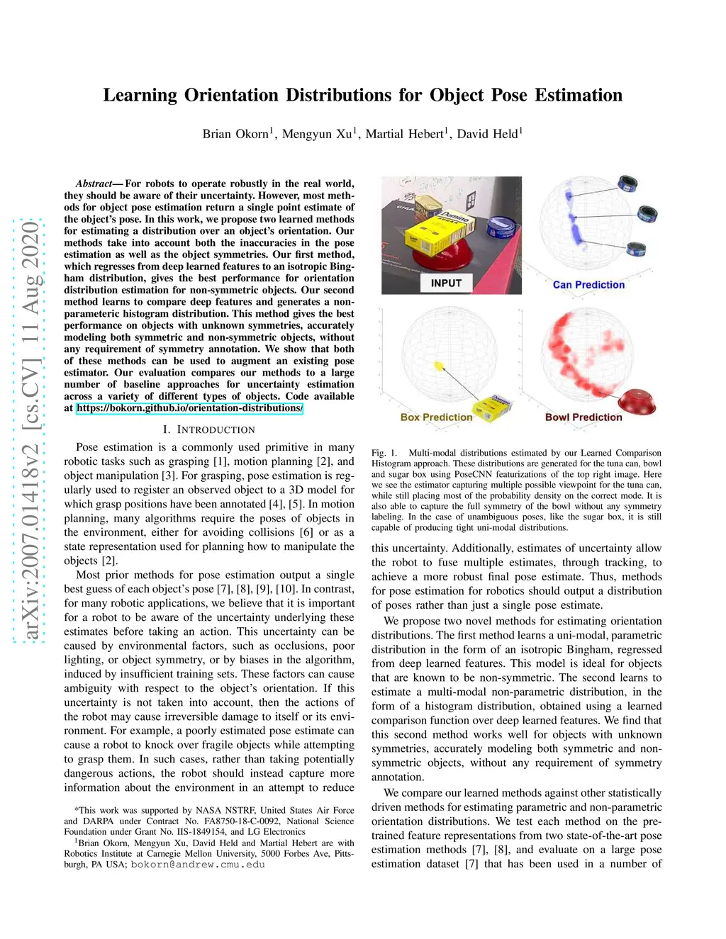 For robots to operate robustly in the real world, they should be aware of their uncertainty. However, most methods for object pose estimation return a single point estimate of the object's pose. In this work, we propose two learned methods for estimating a distribution over an object's orientation. Our methods take into account both the inaccuracies in the pose estimation as well as the object symmetries. Our first method, which regresses from deep learned features to an isotropic Bingham distribution, gives the best performance for orientation distribution estimation for non-symmetric objects. Our second method learns to compare deep features and generates a non-parameteric histogram distribution. This method gives the best performance on objects with unknown symmetries, accurately modeling both symmetric and non-symmetric objects, without any requirement of symmetry annotation. We show that both of these methods can be used to augment an existing pose estimator. Our evaluation compares our methods to a large number of baseline approaches for uncertainty estimation across a variety of different types of objects.