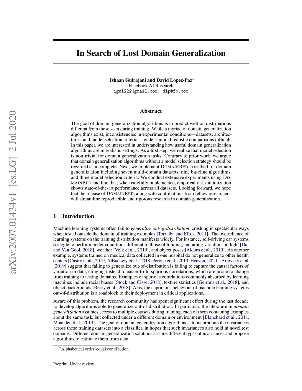 The goal of domain generalization algorithms is to predict well on distributions different from those seen during training. While a myriad of domain generalization algorithms exist, inconsistencies in experimental conditions -- datasets, architectures, and model selection criteria -- render fair and realistic comparisons difficult. In this paper, we are interested in understanding how useful domain generalization algorithms are in realistic settings. As a first step, we realize that model selection is non-trivial for domain generalization tasks. Contrary to prior work, we argue that domain generalization algorithms without a model selection strategy should be regarded as incomplete. Next, we implement DomainBed, a testbed for domain generalization including seven multi-domain datasets, nine baseline algorithms, and three model selection criteria. We conduct extensive experiments using DomainBed and find that, when carefully implemented, empirical risk minimization shows state-of-the-art performance across all datasets. Looking forward, we hope that the release of DomainBed, along with contributions from fellow researchers, will streamline reproducible and rigorous research in domain generalization.