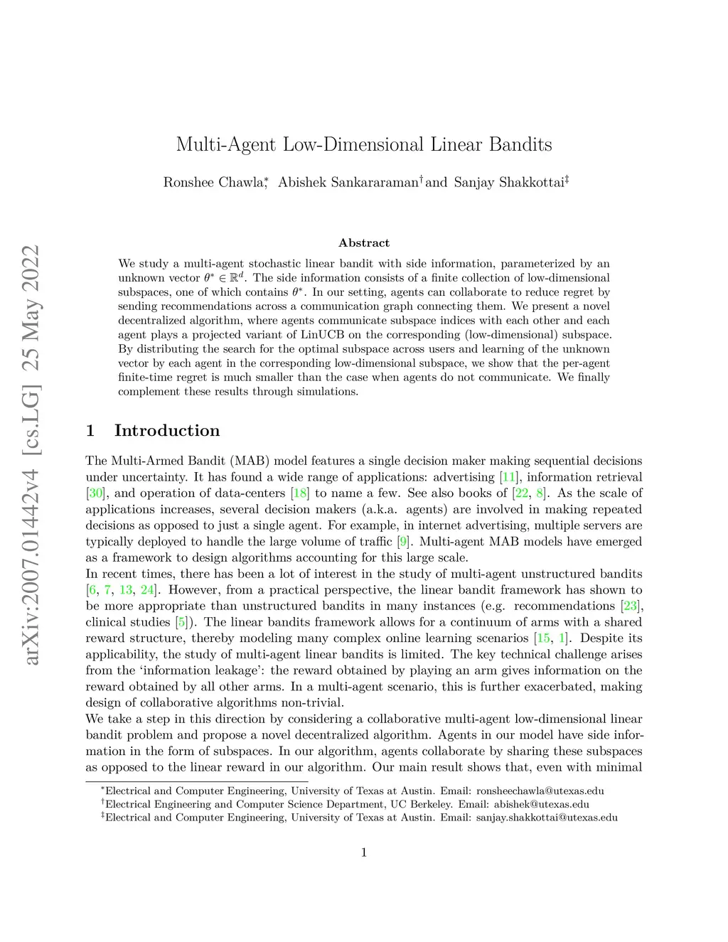 We study a multi-agent stochastic linear bandit with side information, parameterized by an unknown vector . The side information consists of a finite collection of low-dimensional subspaces, one of which contains . In our setting, agents can collaborate to reduce regret by sending recommendations across a communication graph connecting them. We present a novel decentralized algorithm, where agents communicate subspace indices with each other and each agent plays a projected variant of LinUCB on the corresponding (low-dimensional) subspace. By distributing the search for the optimal subspace across users and learning of the unknown vector by each agent in the corresponding low-dimensional subspace, we show that the per-agent finite-time regret is much smaller than the case when agents do not communicate. We finally complement these results through simulations.