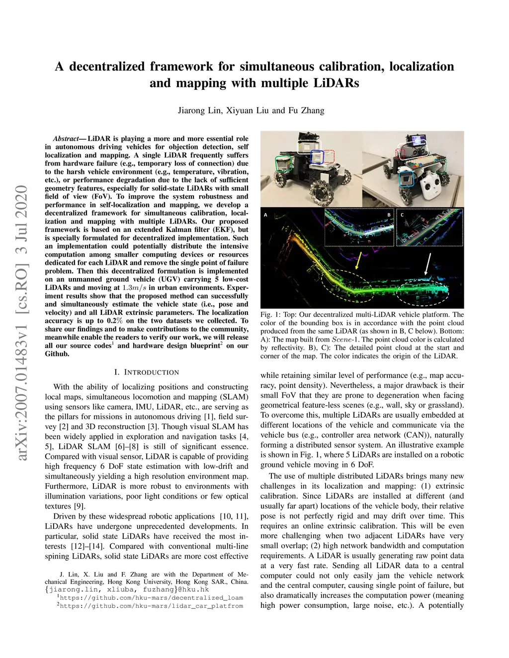 LiDAR is playing a more and more essential role in autonomous driving vehicles for objection detection, self localization and mapping. A single LiDAR frequently suffers from hardware failure (e.g., temporary loss of connection) due to the harsh vehicle environment (e.g., temperature, vibration, etc.), or performance degradation due to the lack of sufficient geometry features, especially for solid-state LiDARs with small field of view (FoV). To improve the system robustness and performance in self-localization and mapping, we develop a decentralized framework for simultaneous calibration, localization and mapping with multiple LiDARs. Our proposed framework is based on an extended Kalman filter (EKF), but is specially formulated for decentralized implementation. Such an implementation could potentially distribute the intensive computation among smaller computing devices or resources dedicated for each LiDAR and remove the single point of failure problem. Then this decentralized formulation is implemented on an unmanned ground vehicle (UGV) carrying 5 low-cost LiDARs and moving at in urban environments. Experiment results show that the proposed method can successfully and simultaneously estimate the vehicle state (i.e., pose and velocity) and all LiDAR extrinsic parameters. The localization accuracy is up to 0.2% on the two datasets we collected. To share our findings and to make contributions to the community, meanwhile enable the readers to verify our work, we will release all our source codes and hardware design blueprint on our Github.