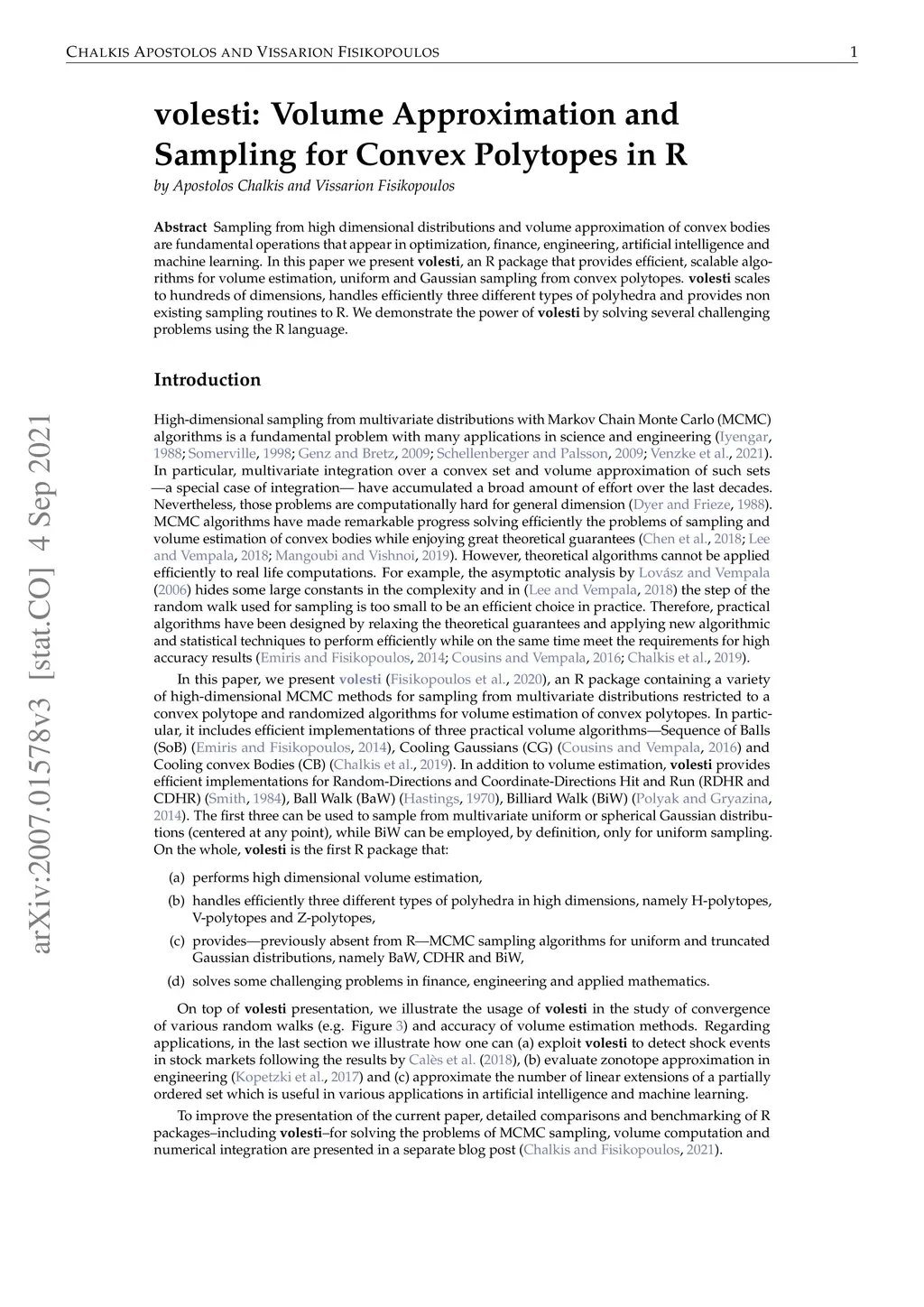 Sampling from high dimensional distributions and volume approximation of convex bodies are fundamental operations that appear in optimization, finance, engineering, artificial intelligence and machine learning. In this paper we present volesti, an R package that provides efficient, scalable algorithms for volume estimation, uniform and Gaussian sampling from convex polytopes. volesti scales to hundreds of dimensions, handles efficiently three different types of polyhedra and provides non existing sampling routines to R. We demonstrate the power of volesti by solving several challenging problems using the R language.