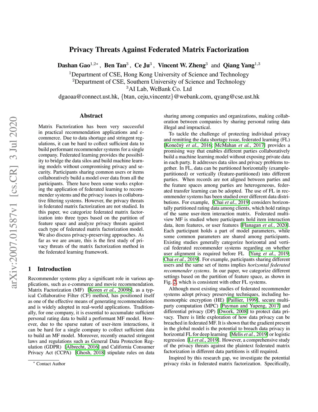 Matrix Factorization has been very successful in practical recommendation applications and e-commerce. Due to data shortage and stringent regulations, it can be hard to collect sufficient data to build performant recommender systems for a single company. Federated learning provides the possibility to bridge the data silos and build machine learning models without compromising privacy and security. Participants sharing common users or items collaboratively build a model over data from all the participants. There have been some works exploring the application of federated learning to recommender systems and the privacy issues in collaborative filtering systems. However, the privacy threats in federated matrix factorization are not studied. In this paper, we categorize federated matrix factorization into three types based on the partition of feature space and analyze privacy threats against each type of federated matrix factorization model. We also discuss privacy-preserving approaches. As far as we are aware, this is the first study of privacy threats of the matrix factorization method in the federated learning framework.