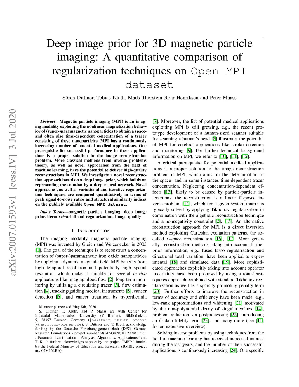 Deep image prior for 3D magnetic particle imaging: A quantitative