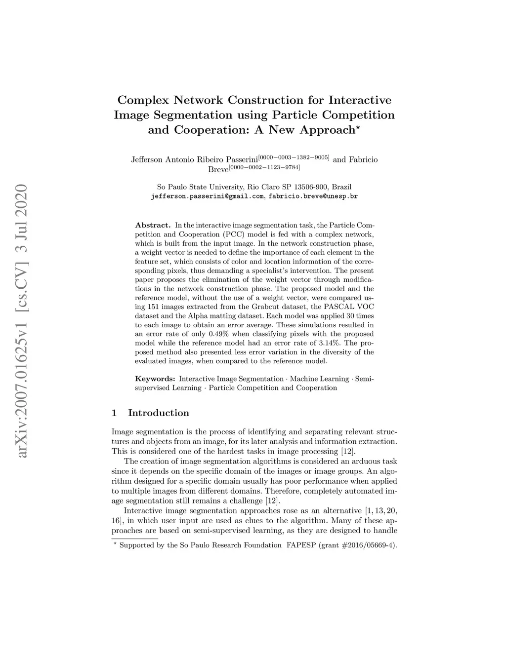 In the interactive image segmentation task, the Particle Competition and Cooperation (PCC) model is fed with a complex network, which is built from the input image. In the network construction phase, a weight vector is needed to define the importance of each element in the feature set, which consists of color and location information of the corresponding pixels, thus demanding a specialist's intervention. The present paper proposes the elimination of the weight vector through modifications in the network construction phase. The proposed model and the reference model, without the use of a weight vector, were compared using 151 images extracted from the Grabcut dataset, the PASCAL VOC dataset and the Alpha matting dataset. Each model was applied 30 times to each image to obtain an error average. These simulations resulted in an error rate of only 0.49\% when classifying pixels with the proposed model while the reference model had an error rate of 3.14\%. The proposed method also presented less error variation in the diversity of the evaluated images, when compared to the reference model.