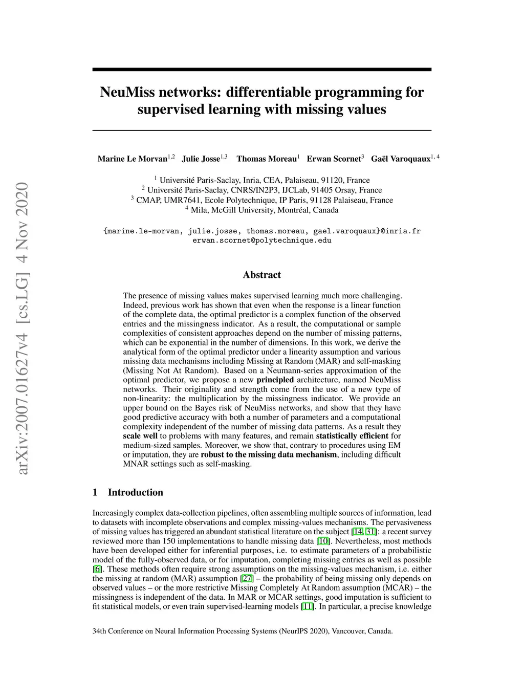 The presence of missing values makes supervised learning much more challenging. Indeed, previous work has shown that even when the response is a linear function of the complete data, the optimal predictor is a complex function of the observed entries and the missingness indicator. As a result, the computational or sample complexities of consistent approaches depend on the number of missing patterns, which can be exponential in the number of dimensions. In this work, we derive the analytical form of the optimal predictor under a linearity assumption and various missing data mechanisms including Missing at Random (MAR) and self-masking (Missing Not At Random). Based on a Neumann-series approximation of the optimal predictor, we propose a new principled architecture, named NeuMiss networks. Their originality and strength come from the use of a new type of non-linearity: the multiplication by the missingness indicator. We provide an upper bound on the Bayes risk of NeuMiss networks, and show that they have good predictive accuracy with both a number of parameters and a computational complexity independent of the number of missing data patterns. As a result they scale well to problems with many features, and remain statistically efficient for medium-sized samples. Moreover, we show that, contrary to procedures using EM or imputation, they are robust to the missing data mechanism, including difficult MNAR settings such as self-masking.