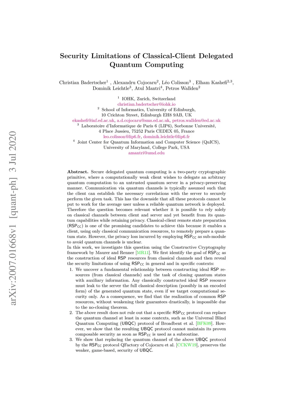 Secure delegated quantum computing allows a computationally weak client to outsource an arbitrary quantum computation to an untrusted quantum server in a privacy-preserving manner. One of the promising candidates to achieve classical delegation of quantum computation is classical-client remote state preparation (), where a client remotely prepares a quantum state using a classical channel. However, the privacy loss incurred by employing as a sub-module is unclear. In this work, we investigate this question using the Constructive Cryptography framework by Maurer and Renner (ICS'11). We first identify the goal of as the construction of ideal RSP resources from classical channels and then reveal the security limitations of using . First, we uncover a fundamental relationship between constructing ideal RSP resources (from classical channels) and the task of cloning quantum states. Any classically constructed ideal RSP resource must leak to the server the full classical description (possibly in an encoded form) of the generated quantum state, even if we target computational security only. As a consequence, we find that the realization of common RSP resources, without weakening their guarantees drastically, is impossible due to the no-cloning theorem. Second, the above result does not rule out that a specific protocol can replace the quantum channel at least in some contexts, such as the Universal Blind Quantum Computing (UBQC) protocol of Broadbent et al. (FOCS '09). However, we show that the resulting UBQC protocol cannot maintain its proven composable security as soon as is used as a subroutine. Third, we show that replacing the quantum channel of the above UBQC protocol by the protocol QFactory of Cojocaru et al. (Asiacrypt '19), preserves the weaker, game-based, security of UBQC.